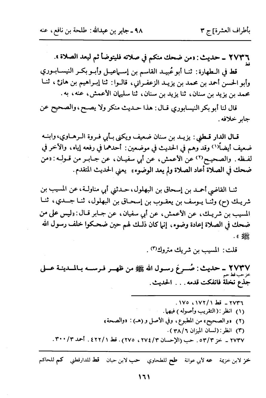 2736 - حَدِيثُ (قط) : " مَنْ ضَحِكَ مِنْكُمْ فِي صَلاتِهِ فَلْيَتَوَضَّأْ ثُمَّ لِيُعِدِ الصَّلاةَ ".