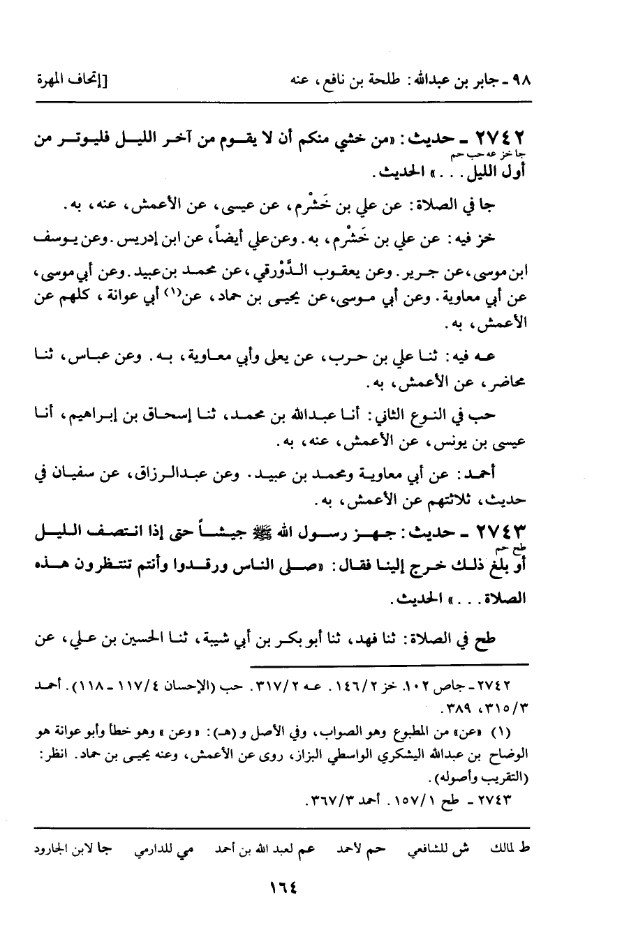 (خز) فِيهِ: عَنْ عَلِيِّ بْنِ خَشْرَمٍ، بِهِ. وَعَنْ عَلِيٍّ أَيْضًا، عَنِ ابْنِ إِدْرِيسَ. وَعَنْ يُوسُفَ بْنِ مُوسَى، عَنْ جَرِيرٍ. وَعَنْ يَعْقُوبَ الدَّوْرَقِيِّ، عَنْ مُحَمَّدِ بْنِ عُبَيْدٍ. وَعَنْ أَبِي مُوسَى، عَنْ أَبِي مُعَاوِيَةَ. وَعَنْ أَبِي مُوسَى، عَن يَحْيَى بْنِ حَمَّادٍ، عَنْ أَبِي عَوَانَةَ، كُلُّهُمْ عَنِ الأَعْمَشِ، بِهِ.