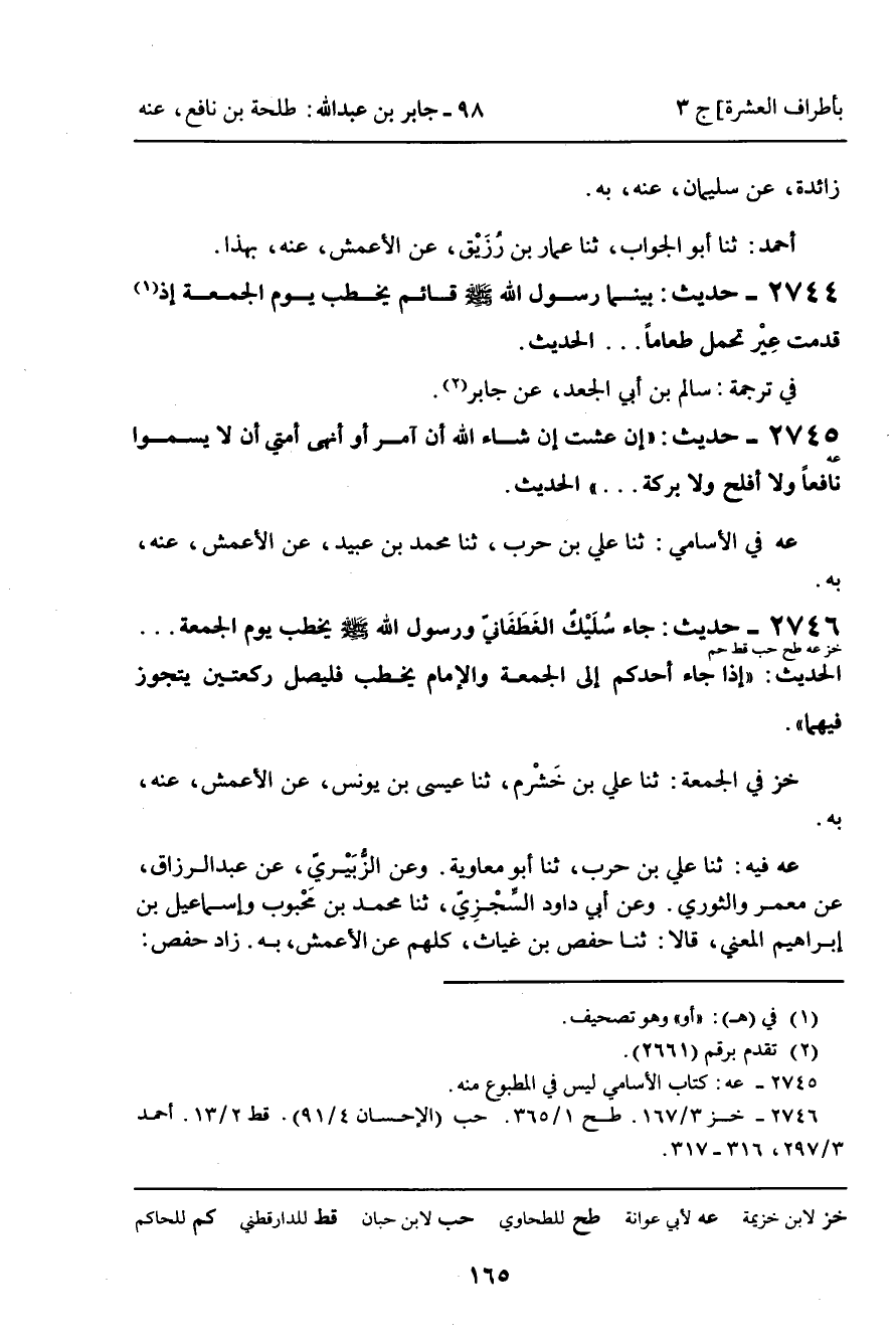 (قط) فِي الْجُمُعَةِ: عَنْ أَبِي مُحَمَّدِ بْنِ صَاعِدٍ، عَنْ يَحْيَى بْنِ حَكِيمٍ الْمُقَوِّمِيِّ، عَنْ أَبِي بَحْرٍ الْبَكْرَاوِيِّ، عَنْ سَعِيدِ بْنِ أَبِي عَرُوبَةَ، عَنِ الْوَلِيدِ أَبِي بِشْرٍ، عَنْهُ، بِهِ. وَعَنْ أَبِي بَكْرٍ النَّيْسَابُورِيِّ، عَنْ عَلِيِّ بْنِ حَرْبٍ، عَنْ أَبِي مُعَاوِيَةَ، عَنِ الأَعْمَشِ، نَحْوَهُ. رَوَاهُ الثَّوْرِيُّ، عَنِ الأَعْمَشِ، عَنْ أَبِي سُفْيَانَ، عَنْ جَابِرٍ، عَنْ سُلَيْكٍ وَسَيَأْتِي.