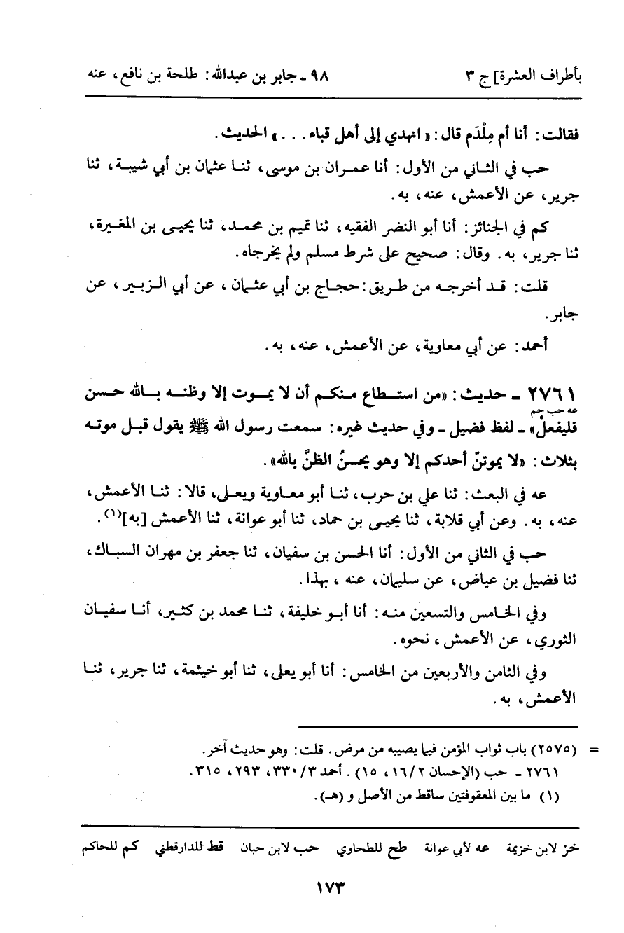2761 - حَدِيثُ (عه حب حم) : " مَنِ اسْتَطَاعَ مِنْكُمْ أَنْ لا يَمُوتَ إِلا وَظَنُّهُ بِاللَّهِ حَسَنٌ فَلْيَفْعَلْ "، لَفْظُ فُضَيْلٍ، وَفِي حَدِيثِ غَيْرِهِ: سَمِعْتُ رَسُولَ اللَّهِ صَلَّى اللَّهُ عَلَيْهِ وَسَلَّمَ يَقُولُ قَبْلَ مَوْتِهِ بِثَلاثٍ: " لا يَمُوتَنَّ أَحَدُكُمْ إِلا وَهُوَ يُحْسِنُ الظَّنَّ بِاللَّهِ ".
