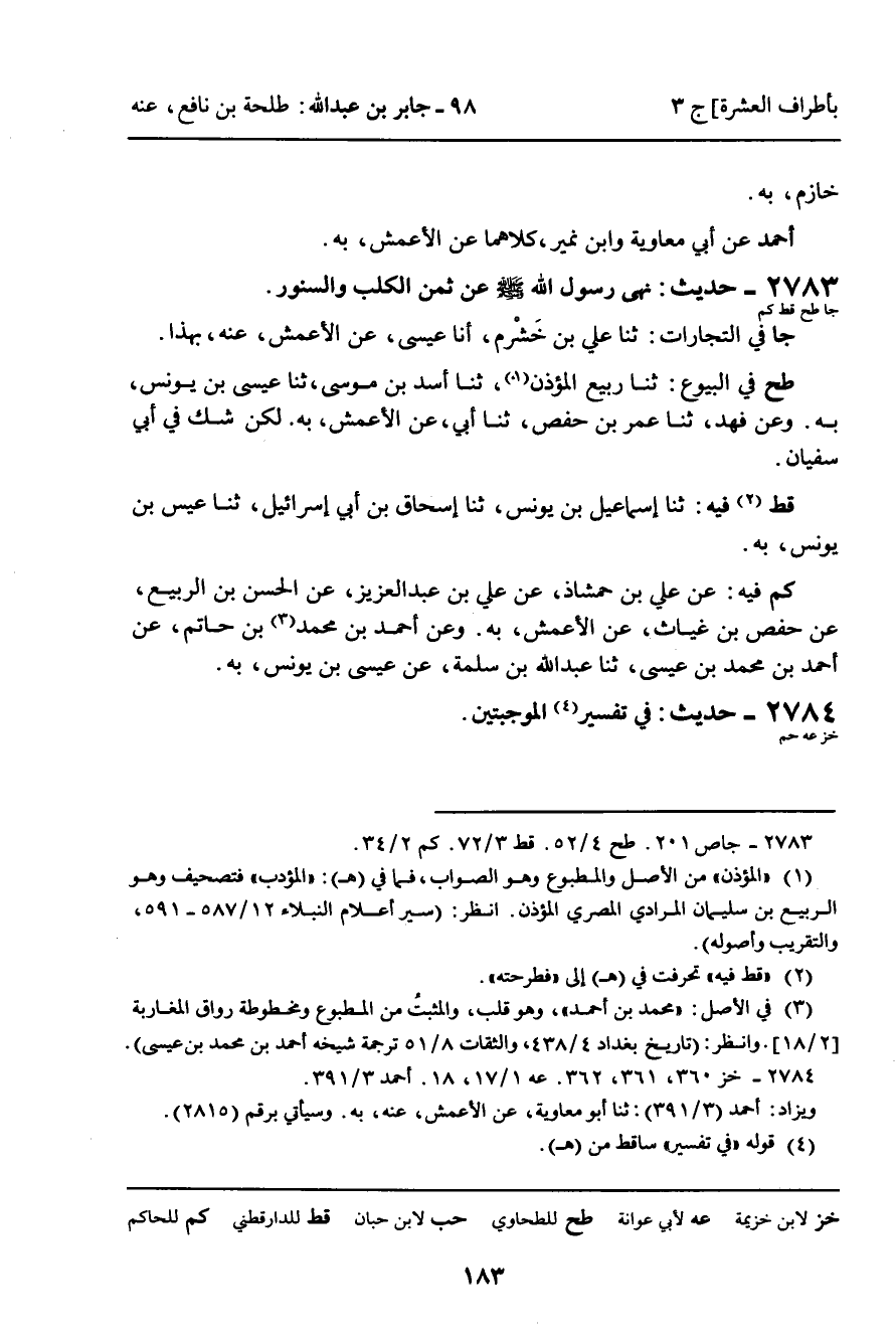 (كم) فِيهِ: عَنْ عَلِيِّ بْنِ حَمْشَاذَ، عَنْ عَلِيِّ بْنِ عَبْدِ الْعَزِيزِ، عَنِ الْحَسَنِ بْنِ الرَّبِيعِ، عَنْ حَفْصِ بْنِ غِيَاثٍ، عَنِ الأَعْمَشِ، بِهِ. وَعَنْ أَحْمَدَ بْنِ مُحَمَّدِ بْنِ حَاتِمٍ، عَنْ أَحْمَدَ بْنِ مُحَمَّدِ بْنِ عِيسَى، ثنا عَبْدُ اللَّهِ بْنُ سَلَمَةَ، عَنْ عِيسَى بْنِ يُونُسَ، بِهِ.