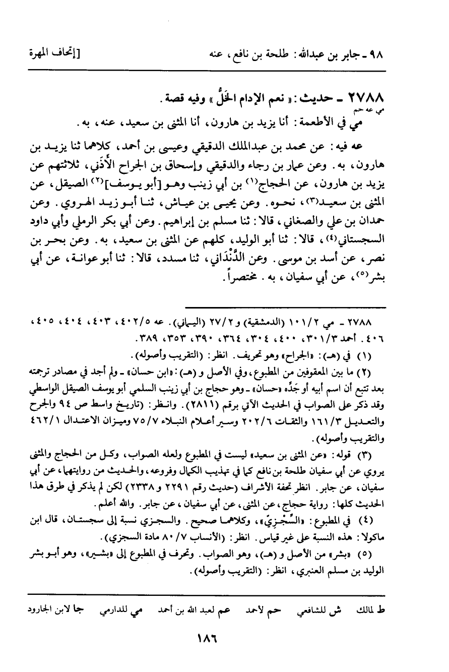 (عه) فِيهِ: عَنْ مُحَمَّدِ بْنِ عَبْدِ الْمَلِكِ الدَّقِيقِيِّ، وَعِيسَى بْنِ أَحْمَدَ، كِلاهُمَا ثنا يَزِيدُ بْنُ هَارُونَ، بِهِ. وَعَنْ عَمَّارِ بْنِ رَجَاءٍ، وَالدَّقِيقِيِّ، وَإِسْحَاقَ بْنِ الْجَرَّاحِ الأَذَنِيِّ، ثَلاثَتُهُمْ عَنْ يَزِيدَ بْنِ هَارُونَ، عَنِ الْحَجَّاجِ بْنِ أَبِي زَيْنَبَ، وَهُوَ أَبُو يُوسُفَ الصَّيْقَلُ، عَنِ الْمُثَنَّى بْنِ سَعِيدٍ، نَحْوَهُ. وَعَنْ يَحْيَى بْنِ عَيَّاشٍ، ثنا أَبُو زَيْدٍ الْهَرَوِيُّ. وَعَنْ حَمْدَانَ بْنِ عَلِيٍّ، وَالصَّغَانِيِّ، قَالا: ثنا مُسْلِمُ بْنُ إِبْرَاهِيمَ. وَعَنْ أَبِي بَكْرٍ الرَّمْلِيِّ، وَأَبِي دَاوُدَ السِّجِسْتَانِيِّ، قَالا: ثنا أَبُو الْوَلِيدِ، كُلُّهُمْ عَنِ الْمُثَنَّى بْنِ سَعِيدٍ، بِهِ. وَعَنْ بَحْرِ بْنِ نَصْرٍ، عَنْ أَسَدِ بْنِ مُوسَى. وَعَنِ الدَّنْدَانِيِّ، ثنا مُسَدَّدٌ، قَالا: ثنا أَبُو عَوَانَةَ، عَنْ أَبِي بِشْرٍ، عَنْ أَبِي سُفْيَانَ، بِهِ. مُخْتَصَرًا.