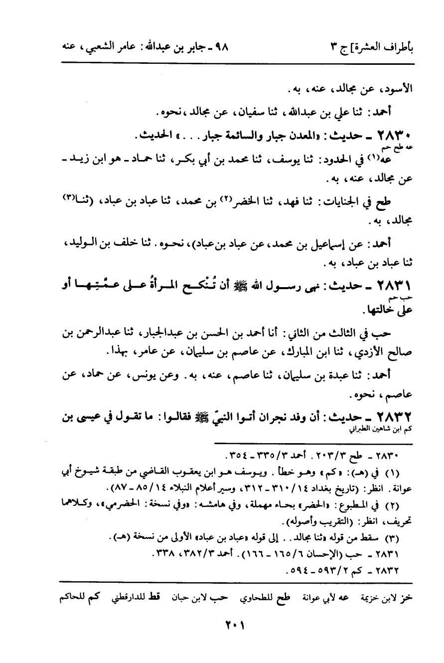 (طح) فِي الْجِنَايَاتِ: ثنا فَهْدٌ، ثنا الْخَضِرُ بْنُ مُحَمَّدٍ، ثنا عَبَّادُ بْنُ عَبَّادٍ، ثنا مُجَالِدٌ، بِهِ.
