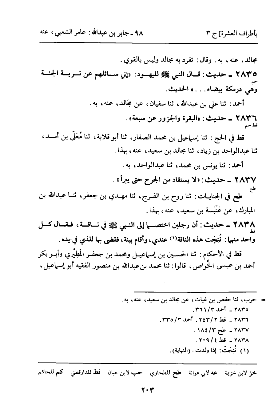 2837 - حَدِيثُ (طح) : " لا يُسْتَقَادُ مِنَ الْجَرْحِ حَتَّى يَبْرَأَ ".