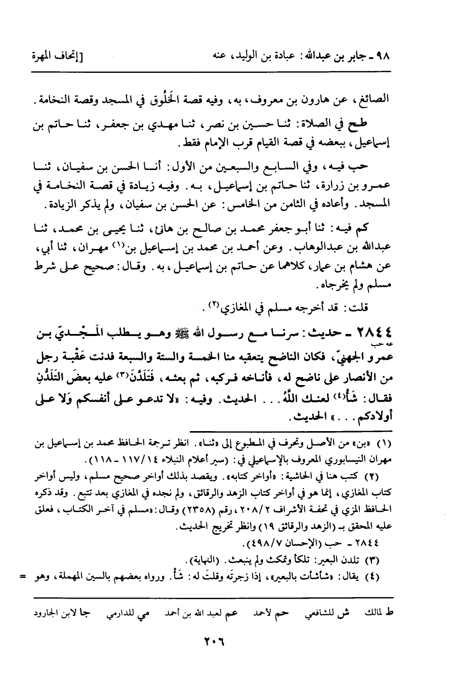 2844 - حَدِيثُ (عه حب) : سِرْنَا مَعَ رَسُولِ اللَّهِ صَلَّى اللَّهُ عَلَيْهِ وَسَلَّمَ، وَهُوَ يَطْلُبُ الْمَجْدِيَّ بْنَ عَمْرٍو الْجُهَنِيَّ، فَكَانَ النَّاضِحُ يَتَعَقَّبُهُ مِنَّا الْخَمْسَةُ وَالسِّتَّةُ وَالسَّبْعَةُ، فَدَنَتْ عُقْبَةُ رَجُلٍ مِنَ الأَنْصَارِ عَلَى نَاضِحٍ لَهُ، فَأَنَاخَهُ فَرَكِبَهُ، ثُمَّ بَعَثَهُ، فَتَلَدَّنَ عَلَيْهِ بَعْضَ التَّلَدُّنِ فَقَالَ: شَأْ لَعَنَكَ اللَّهُ! . . . الْحَدِيثَ. وَفِيهِ: " لا تَدْعُوا عَلَى أَنْفُسِكُمْ وَلا عَلَى أَوْلادِكُمْ. . . " الْحَدِيثَ.