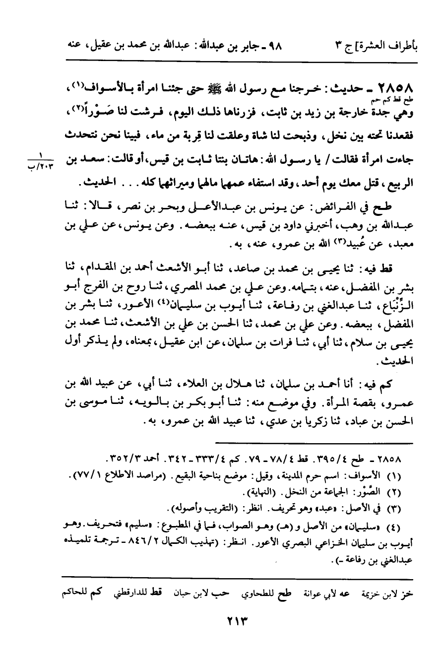 2858 - حَدِيثُ (طح قط كم حم) : خَرَجْنَا مَعَ رَسُولِ اللَّهِ صَلَّى اللَّهُ عَلَيْهِ وَسَلَّمَ حَتَّى جِئْنَا امْرَأَةً بِالأَسْوَافِ، وَهِيَ جَدَّةُ خَارِجَةَ بْنِ زَيْدِ بْنِ ثَابِتٍ، فَزُرْنَاهَا ذَلِكَ الْيَوْمَ، فَرَشَّتْ لَنَا صُورًا، فَقَعَدْنَا تَحْتَهُ بَيْنَ نَخْلٍ، وَذَبَحَتْ لَنَا شَاةً وَعَلَّقَتْ لَنَا قِرْبَةً مِنْ مَاءٍ، فَبَيْنَا نَحْنُ نَتَحَدَّثُ جَاءَتِ امْرَأَةٌ، فَقَالَتْ: يَا رَسُولَ اللَّهِ، هَاتَانِ بِنْتَا ثَابِتِ بْنِ قَيْسٍ، أَوْ قَالَتْ: سَعْدِ بْنِ الرَّبِيعِ، قُتِلَ مَعَكَ يَوْمَ أُحُدٍ، وَقَدِ اسْتَفَاءَ عَمُّهُمَا مَالَهُمَا وَمِيرَاثَهُمَا كُلَّهُ ... الْحَدِيثَ.