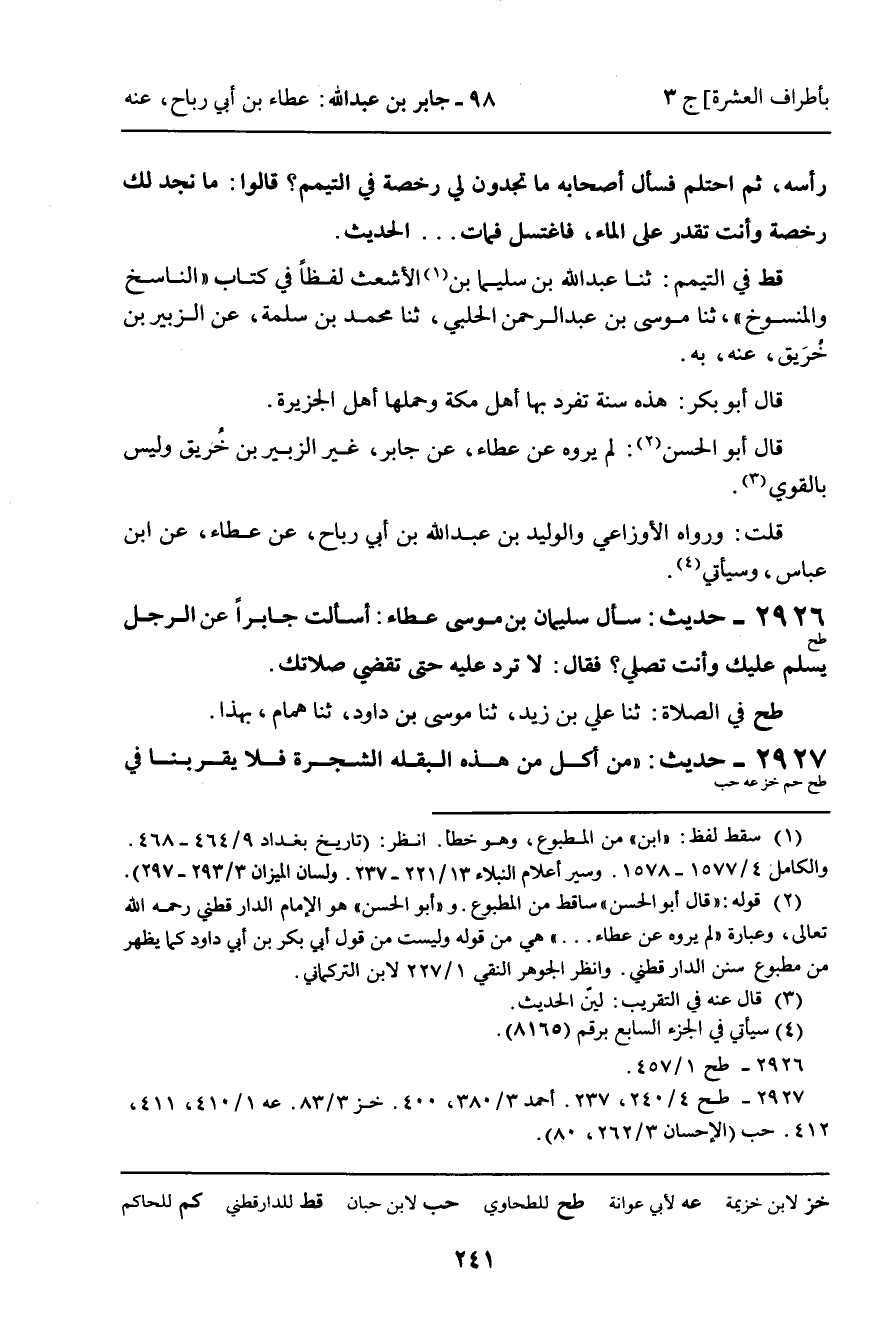 2926 - حَدِيثُ (طح) : سَأَلَ سُلَيْمَانُ بْنُ مُوسَى عَطَاءً: أَسَأَلْتَ جَابِرًا عَنِ الرَّجُلِ يُسَلِّمُ عَلَيْكَ وَأَنْتَ تُصَلِّي؟ فَقَالَ: لا تَرُدَّ عَلَيْهِ حَتَّى تَقْضِيَ صَلاتَكَ.