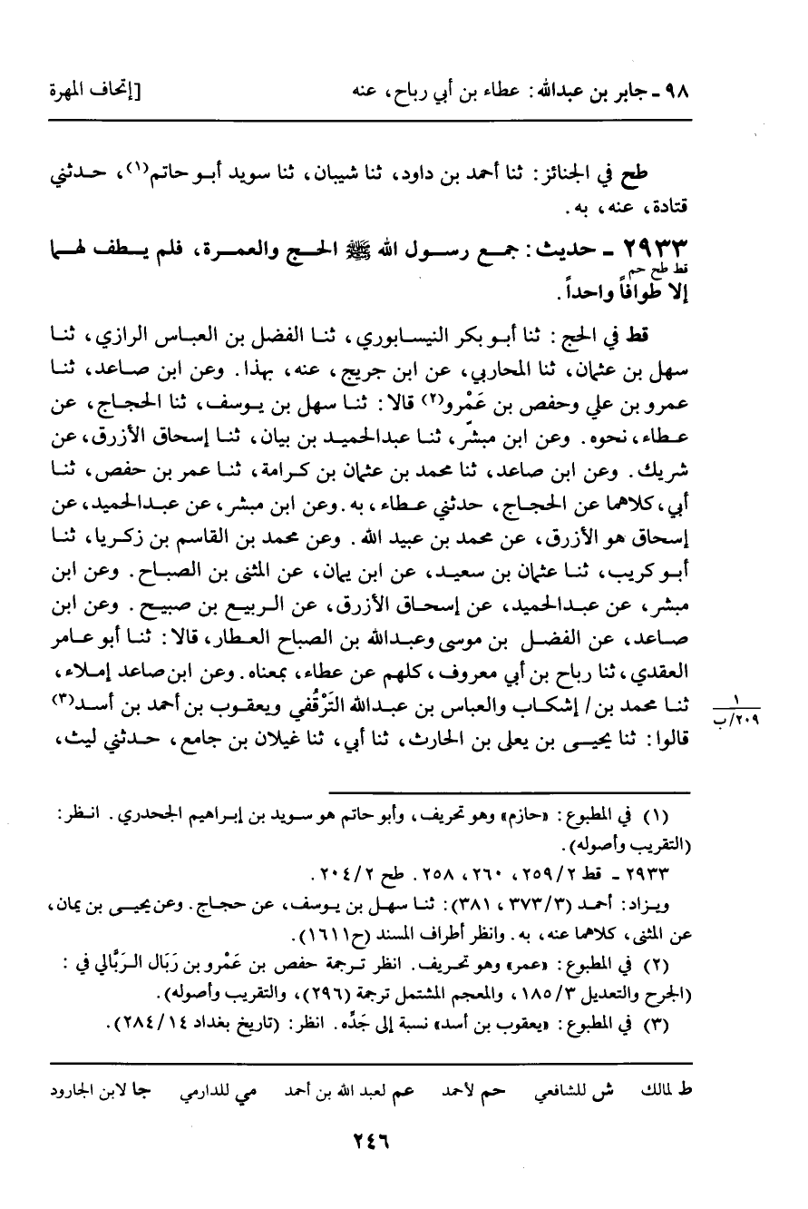 2933 - حَدِيثُ (قط طح حم) : جَمَعَ رَسُولُ اللَّهِ صَلَّى اللَّهُ عَلَيْهِ وَسَلَّمَ الْحَجَّ وَالْعُمْرَةَ، فَلَمْ يَطُفْ لَهُمَا إِلا طَوَافًا وَاحِدًا.