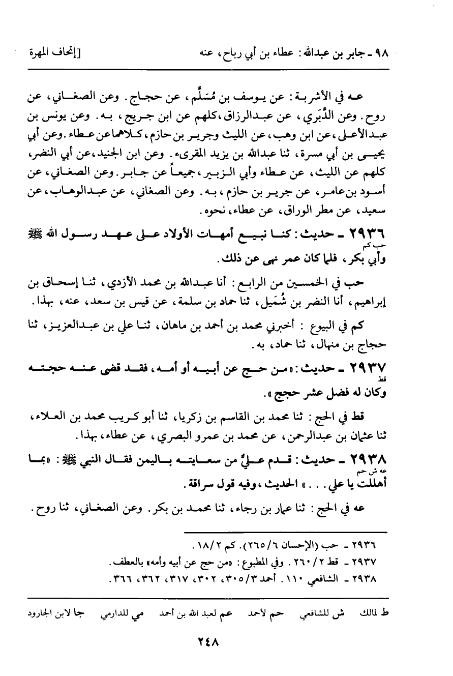 (عه) فِي الْحَجِّ: ثنا عَمَّارُ بْنُ رَجَاءٍ، ثنا مُحَمَّدُ بْنُ بَكْرٍ. وَعَنِ الصَّغَانِيِّ، ثنا رَوْحٌ.