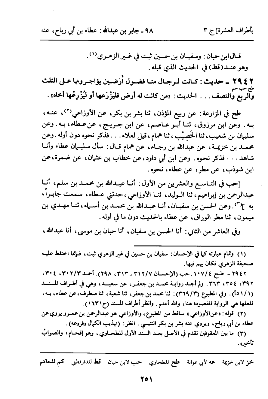 (حب) فِي التَّاسِعِ وَالْعِشْرِينَ مِنَ الأَوَّلِ: أنا عَبْدُ اللَّهِ بْنُ مُحَمَّدِ بْنِ سَلْمٍ، أنا عَبْدُ الرَّحْمَنِ بْنُ إِبْرَاهِيمَ، ثنا الْوَلِيدُ، ثنا الأَوْزَاعِيُّ، حَدَّثَنِي عَطَاءٌ، سَمِعْتُ جَابِرًا، بِهِ. وَعَنِ الْحَسَنِ بْنِ سُفْيَانَ، أنا عَبْدُ اللَّهِ بْنُ مُحَمَّدِ بْنِ أَسْمَاءَ، ثنا مَهْدِيُّ بْنُ مَيْمُونٍ، ثنا مَطَرٌ الْوَرَّاقُ، عَنْ عَطَاءٍ بِالْحَدِيثِ دُونَ مَا فِي أَوَّلِهِ.