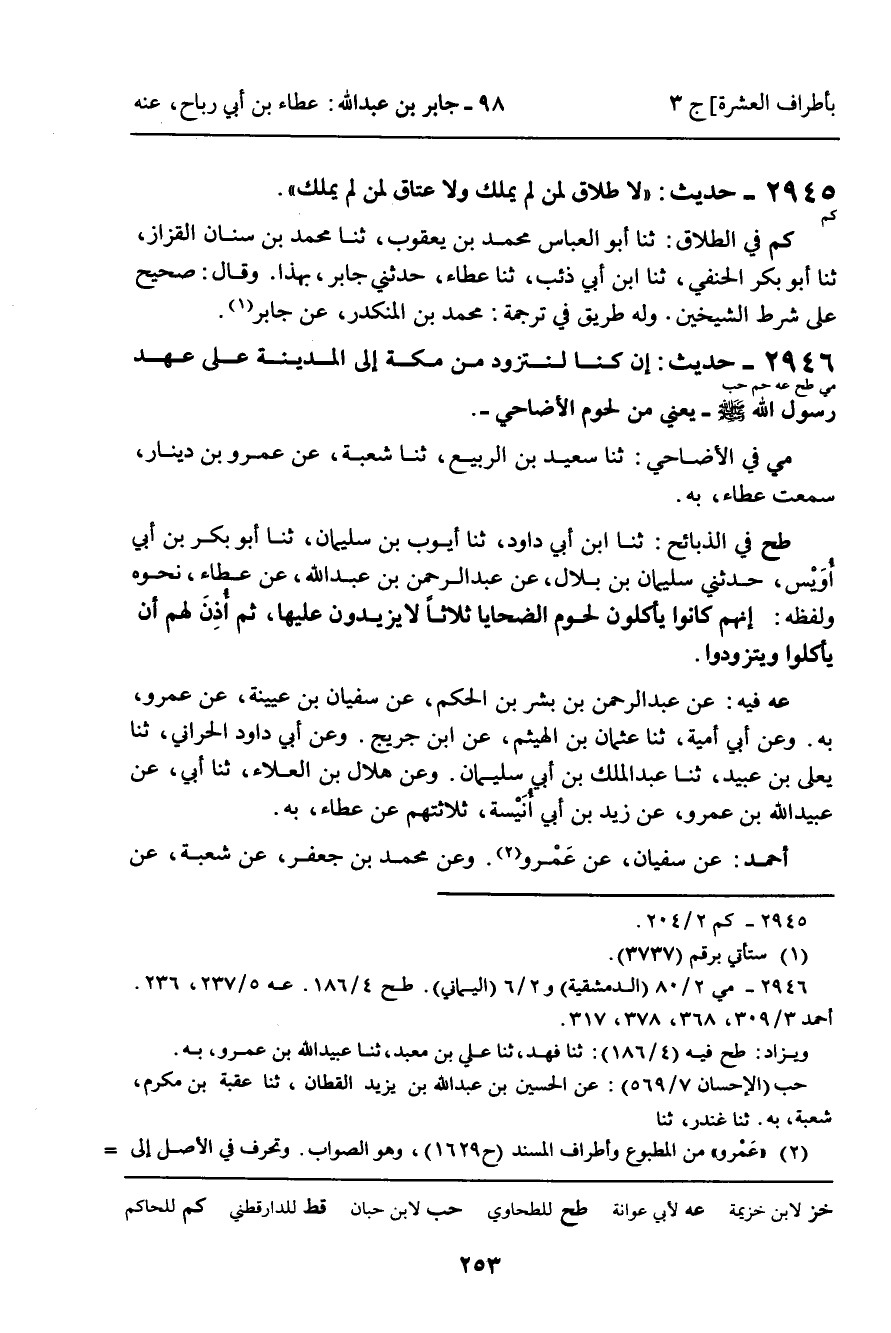 (كم) فِي الطَّلاقِ: ثنا أَبُو الْعَبَّاسِ مُحَمَّدُ بْنُ يَعْقُوبَ، ثنا مُحَمَّدُ بْنُ سِنَانٍ الْقَزَّازُ، ثنا أَبُو بَكْرٍ الْحَنَفِيُّ، ثنا ابْنُ أَبِي ذِئْبٍ، ثنا عَطَاءٌ، حَدَّثَنِي جَابِرٌ بِهَذَا. وَقَالَ: صَحِيحٌ عَلَى شَرْطِ الشَّيْخَيْنِ. وَلَهُ طَرِيقٌ فِي تَرْجَمَةِ: مُحَمَّدِ بْنِ الْمُنْكَدِرِ، عَنْ جَابِرٍ.