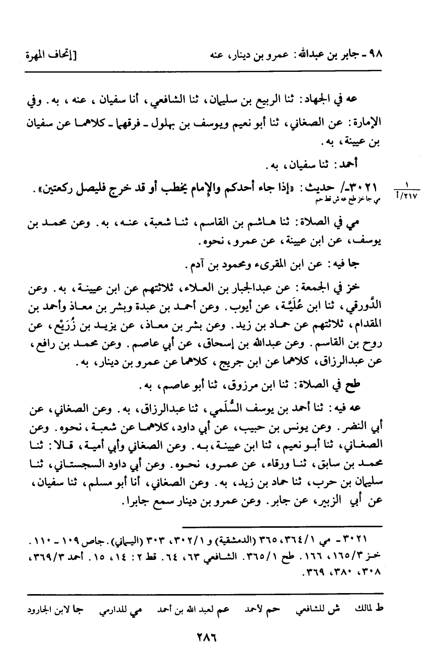 (عه) فِيهِ: ثنا أَحْمَدُ بْنُ يُوسُفَ السُّلَمِيُّ، ثنا عَبْدُ الرَّزَّاقِ، بِهِ. وَعَنِ الصَّغَانِيِّ، عَنْ أَبِي النَّضْرِ، وَعَنْ يُونُسَ بْنِ حَبِيبٍ، عَنْ أَبِي دَاوُدَ، كِلاهُمَا عَنْ شُعْبَةَ، نَحْوَهُ. وَعَنِ الصَّغَانِيِّ، ثنا أَبُو نُعَيْمٍ، ثنا ابْنُ عُيَيْنَةَ، بِهِ. وَعَنِ الصَّغَانِيِّ، وَأَبِي أُمَيَّةَ، قَالا: ثنا مُحَمَّدُ بْنُ سَابِقٍ، ثنا وَرْقَاءُ، عَنْ عَمْرٍو، نَحْوَهُ. وَعَنْ أَبِي دَاوُدَ السِّجِسْتَانِيِّ، ثنا سُلَيْمَانُ بْنُ حَرْبٍ، ثنا حَمَّادُ بْنُ زَيْدٍ، بِهِ. وَعَنِ الصَّغَانِيِّ، أنا أَبُو مُسْلِمٍ، ثنا سُفْيَانُ، عَنْ أَبِي الزُّبَيْرِ، عَنْ جَابِرٍ. وَعَنْ عَمْرِو بْنِ دِينَارٍ، سَمِعَ جَابِرًا.