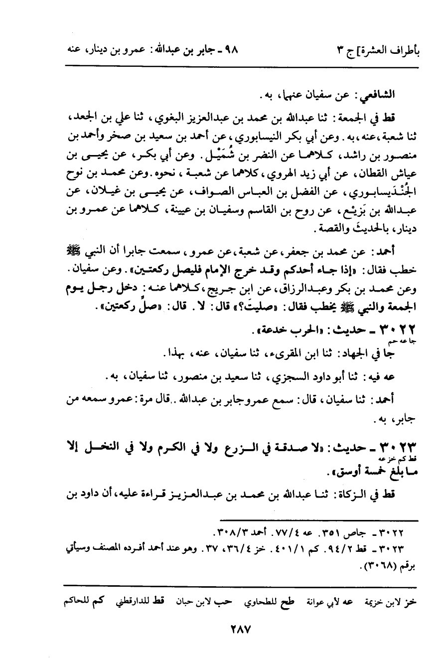 (خز) فِي الزَّكَاةِ: عَنْ مُحَمَّدِ بْنِ يَحْيَى، عَنْ عَبْدِ الرَّزَّاقِ، وَالْهَيْثَمِ بْنِ جَمِيلٍ، وَدَاوُدَ بْنِ عَمْرٍو، فَرَّقَهُمْ. وَعَنْ عُبَيْدِ بْنِ آدَمَ، عَنْ مَنْصُورِ بْنِ زَيْدٍ. وَعَنْ أَحْمَدَ بْنِ عَبْدِ اللَّهِ بْنِ الْبَرْقِيِّ، عَنْ سَعِيدِ بْنِ أَبِي مَرْيَمَ، كُلُّهُمْ عَنْ مُحَمَّدِ بْنِ مُسْلِمٍ، عَنْهُ، بِلَفْظِ: " لَيْسَ عَلَى الرَّجُلِ الْمُسْلِمِ زَكَاةٌ فِي كَرْمِهِ وَلا فِي زَرْعِهِ إِذَا كَانَ أَقَلَّ مِنْ خَمْسَةِ أَوْسُقٍ "، وَزَادَ دَاوُدُ فِي رِوَايَتِهِ. وَعَنْ أَبِي سَعِيدٍ الْخُدْرِيِّ، مِثْلُهُ. وَعَنْ مُحَمَّدِ بْنِ يَحْيَى، عَنْ عَبْدِ الرَّزَّاقِ، أَخْبَرَنِي ابْنُ جُرَيْجٍ، أَخْبَرَنِي عَمْرُو بْنُ دِينَارٍ، قَالَ: سَمِعْتُهُ مِنْ غَيْرِ وَاحِدٍ، عَنْ جَابِرِ بْنِ عَبْدِ اللَّهِ، بِهِ.