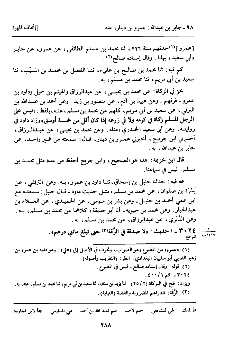 3024 - حَدِيثُ (كم طح) : " لا صَدَقَةَ فِي الرِّقَةِ حَتَّى تَبْلُغَ مِائَتَيْ دِرْهَمٍ ".