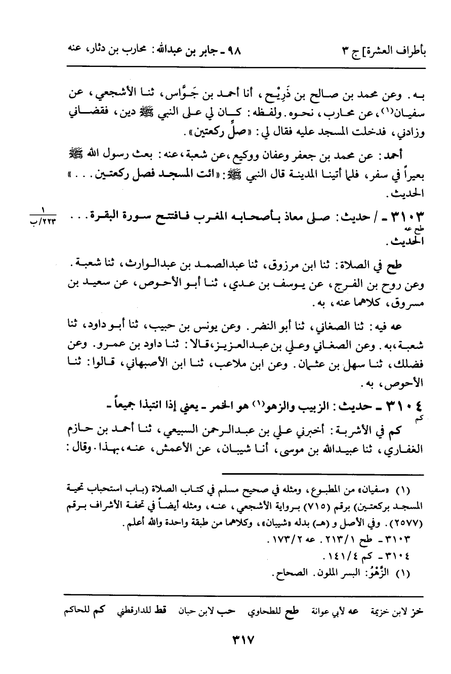 3104 - حَدِيثُ (كم) : الزَّبِيبُ، وَالزَّهْوُ هُوَ الْخَمْرُ، يَعْنِي: إِذَا انْتَبَذَا جَمِيعًا، (كم) فِي الأَشْرِبَةِ: أَخْبَرَنِي عَلِيُّ بْنُ عَبْدِ الرَّحْمَنِ السَّبِيعِيُّ، ثنا أَحْمَدُ بْنُ حَازِمٍ الْغِفَارِيُّ، ثنا عُبَيْدُ اللَّهِ بْنُ مُوسَى، أنا شَيْبَانُ، عَنِ الأَعْمَشِ، عَنْهُ، بِهَذَا. وَقَالَ: