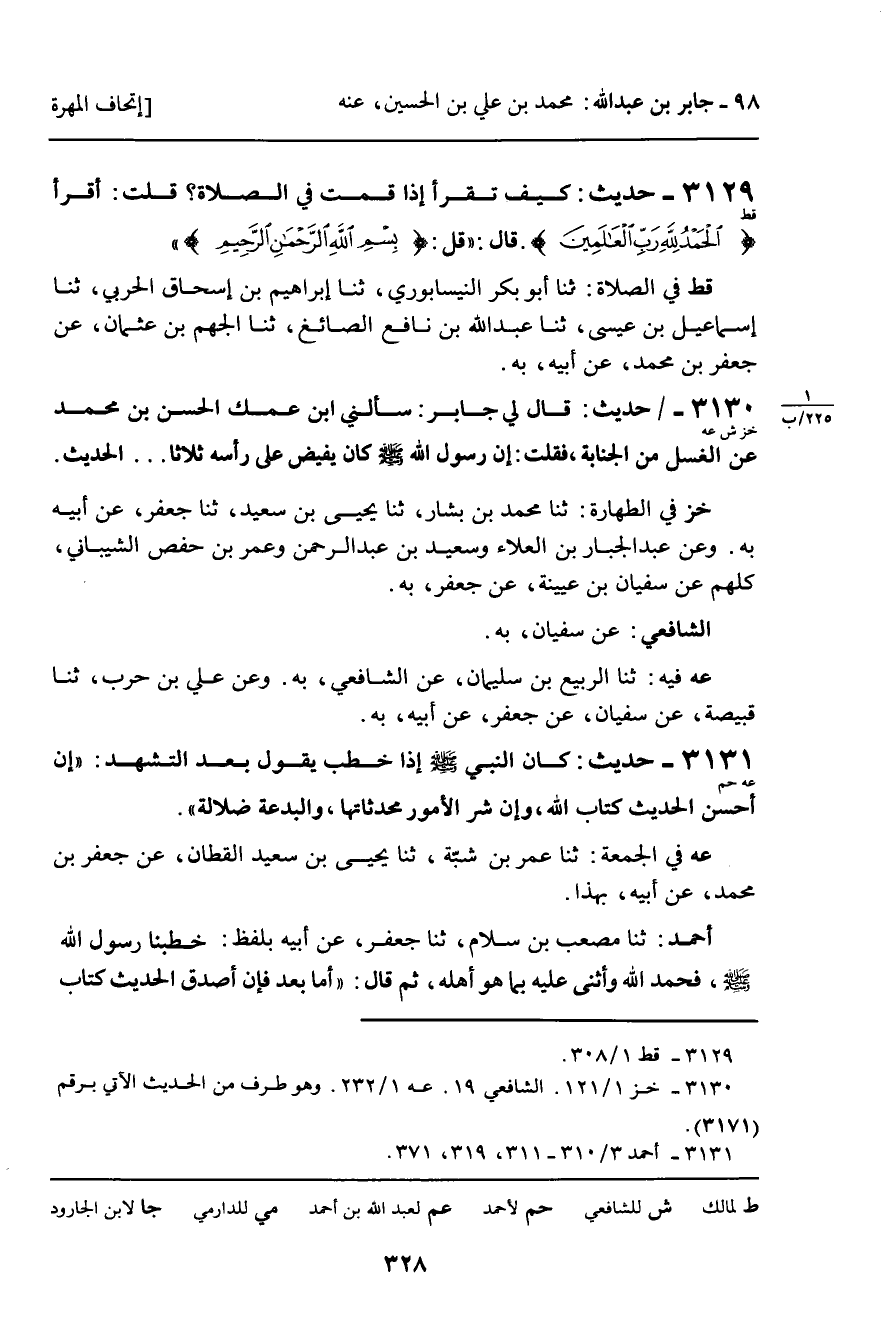 3130 - حَدِيثُ (خز ش عه) : قَالَ لِي جَابِرٌ: سَأَلَنِي ابْنُ عَمِّكَ الْحَسَنُ بْنُ مُحَمَّدٍ، عَنِ الْغُسْلِ مِنَ الْجَنَابَةِ، فَقُلْتُ: إِنَّ رَسُولَ اللَّهِ صَلَّى اللَّهُ عَلَيْهِ وَسَلَّمَ كَانَ يُفِيضُ عَلَى رَأْسِهِ ثَلاثًا. . . الْحَدِيثَ.