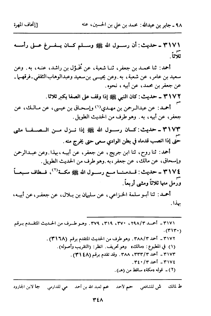 أَحْمَدُ: عَنْ عَبْدِ الرَّحْمَنِ بْنِ مَهْدِيٍّ، وَإِسْحَاقَ بْنِ عِيسَى، عَنْ مَالِكٍ، عَنْ جَعْفَرٍ، عَنْ أَبِيهِ، بِهِ. وَهُوَ طَرَفٌ مِنَ الْحَدِيثِ الطَّوِيلِ.