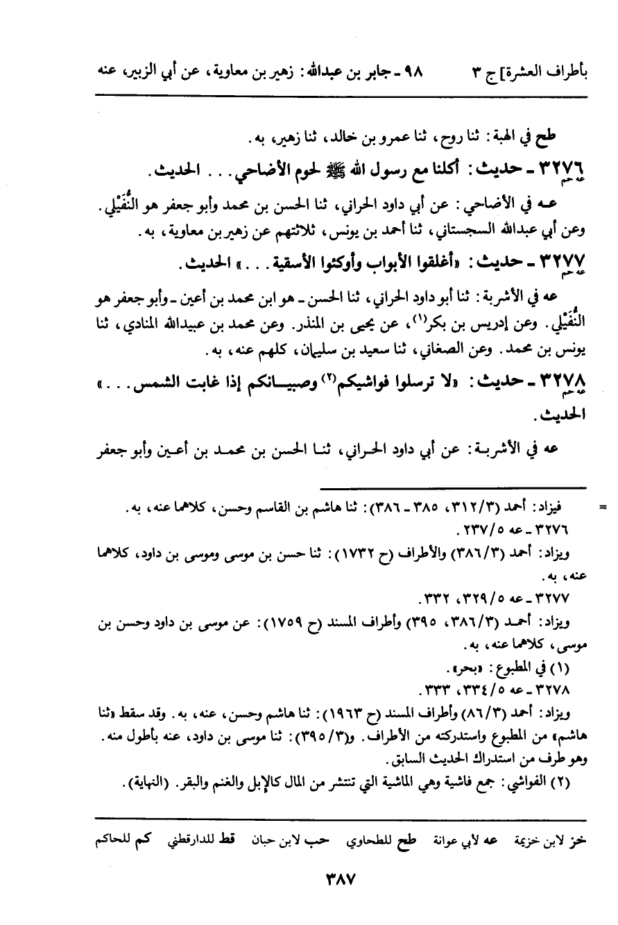 (عه) فِي الأَضَاحِي: عَنْ أَبِي دَاوُدَ الْحَرَّانِيِّ، ثنا الْحَسَنُ بْنُ مُحَمَّدٍ، وَأَبُو جَعْفَرٍ، هُوَ النُّفَيْلِيُّ. وَعَنْ أَبِي عَبْدِ اللَّهِ السِّجِسْتَانِيِّ، ثنا أَحْمَدُ بْنُ يُونُسَ، ثَلاثَتُهُمْ عَنْ زُهَيْرِ بْنِ مُعَاوِيَةَ، بِهِ.