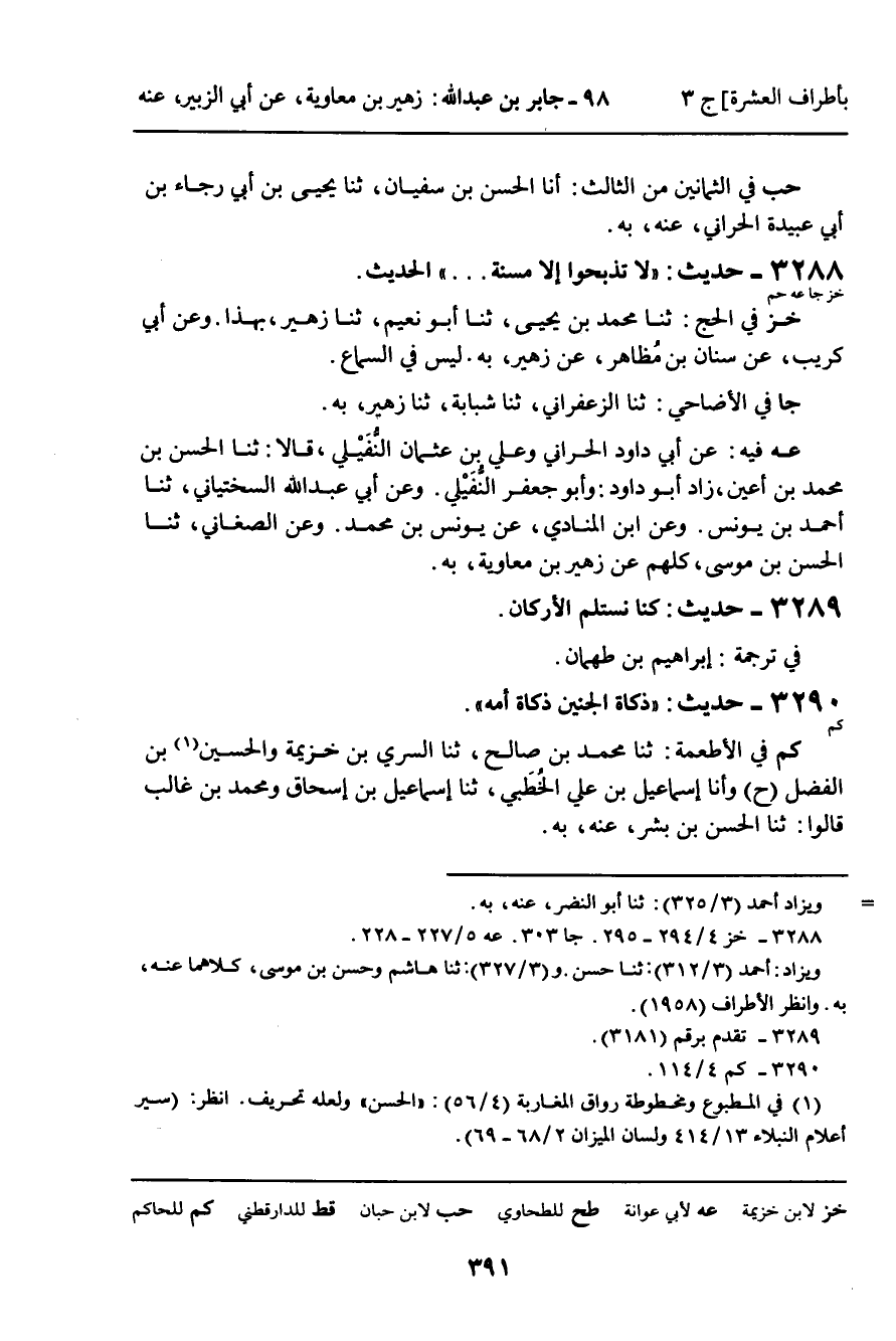 3288 - حَدِيثُ (خز جا عه حم) : " لا تَذْبَحُوا إِلا مُسِنَّةً. . . " الْحَدِيثَ.