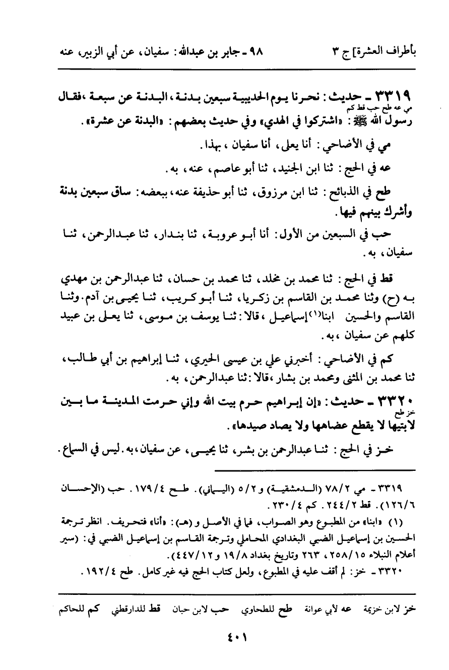 قط فِي الْحَجِّ: ثنا مُحَمَّدُ بْنُ مَخْلَدٍ، ثنا مُحَمَّدُ بْنُ حَسَّانٍ، ثنا عَبْدُ الرَّحْمَنِ بْنُ مَهْدِيٍّ بِهِ ح وَثَنَا مُحَمَّدُ بْنُ الْقَاسِمِ بْنِ زَكَرِيَّا، ثنا أَبُو كُرَيْبٍ، ثنا يَحْيَى بْنُ آدَمَ. وَثَنَا الْقَاسِمُ، وَالْحُسَيْنُ ابْنَا إِسْمَاعِيلَ، قَالا: ثنا يُوسُفُ بْنُ مُوسَى، ثنا يَعْلَى بْنُ عُبَيْدٍ كُلُّهُمْ عَنْ سُفْيَانَ، بِهِ.