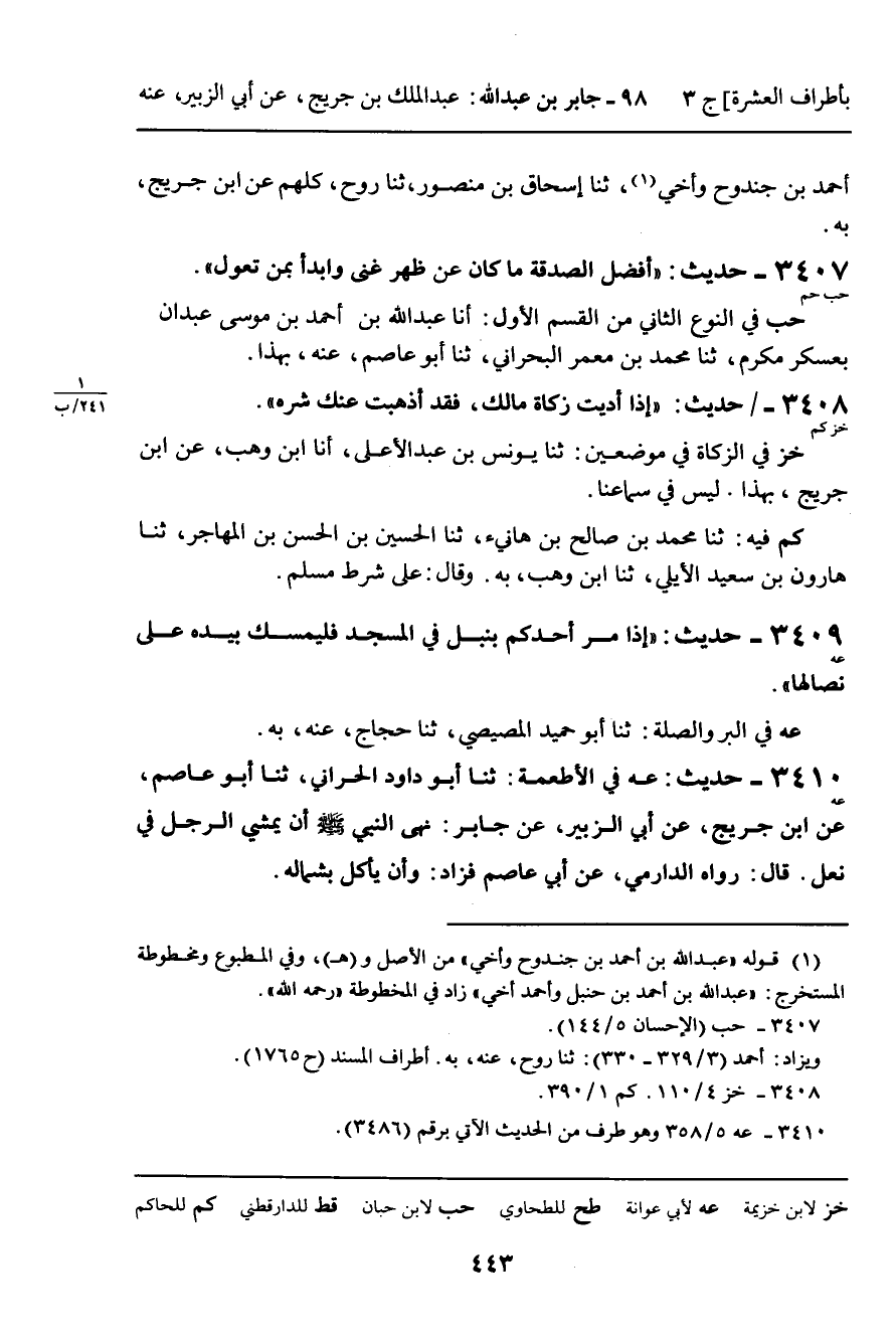 3410 - حَدِيثُ (عه) : (عه) فِي الأَطْعِمَةِ: ثنا أَبُو دَاوُدَ الْحَرَّانِيُّ، ثنا أَبُو عَاصِمٍ، عَنِ ابْنِ جُرَيْجٍ، عَنْ أَبِي الزُّبَيْرِ، عَنْ جَابِرٍ: نَهَى النَّبِيُّ صَلَّى اللَّهُ عَلَيْهِ وَسَلَّمَ أَنْ يَمْشِيَ الرَّجُلُ فِي نَعْلٍ. قَالَ: رَوَاهُ الدَّارِمِيُّ، عَنْ أَبِي عَاصِمٍ، فَزَادَ: وَأَنْ يَأْكُلَ بِشِمَالِهِ.