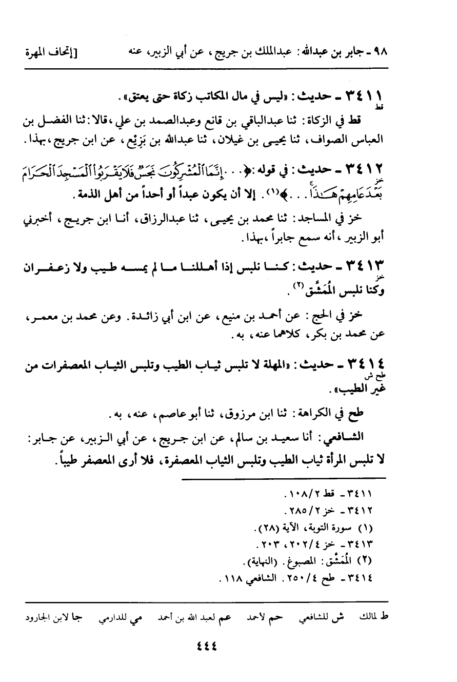 3413 - حَدِيثُ (خز) : كُنَّا نَلْبَسُ إِذَا أَهْلَلْنَا مَا لَمْ يَمَسَّهُ طِيبٌ وَلا زَعْفَرَانٌ وَكُنَّا نَلْبَسُ الْمُمَشَّقَ.