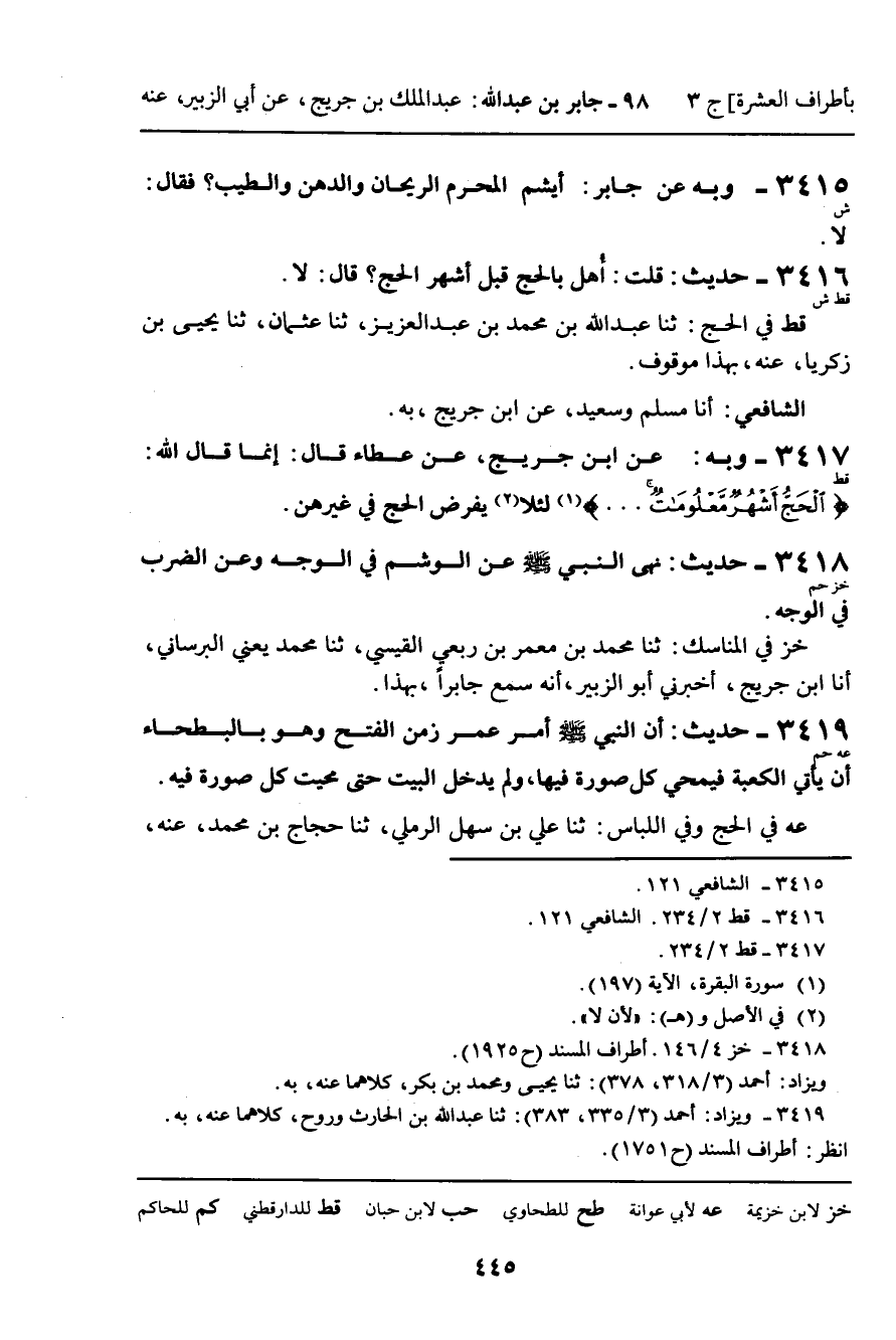 3416 - حَدِيثُ (قط ش) : قُلْتُ: أَهَلَّ بِالْحَجِّ قَبْلَ أَشْهُرِ الْحَجِّ؟ قَالَ: لا.