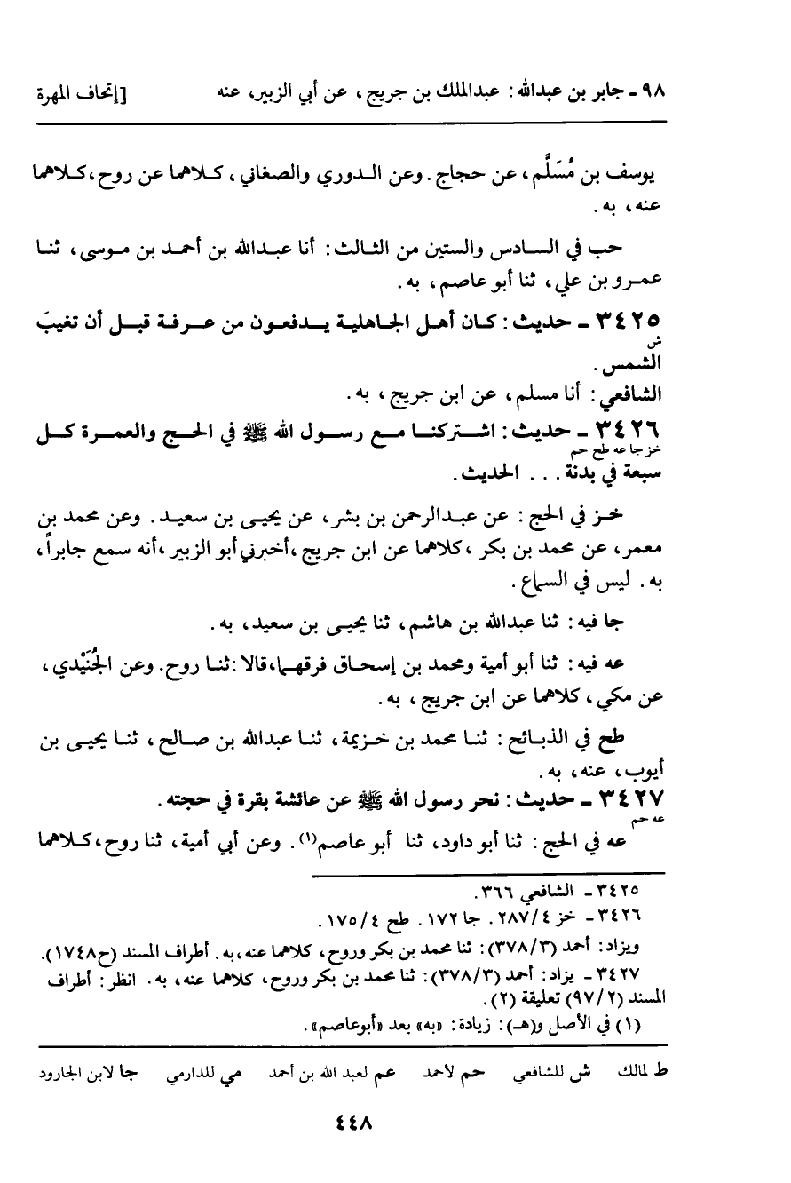 (خز) فِي الْحَجِّ: عَنْ عَبْدِ الرَّحْمَنِ بْنِ بِشْرٍ، عَنْ يَحْيَى بْنِ سَعِيدٍ. وَعَنْ مُحَمَّدِ بْنِ مَعْمَرٍ، عَنْ مُحَمَّدِ بْنِ بَكْرٍ، كِلاهُمَا عَنِ ابْنِ جُرَيْجٍ، أَخْبَرَنِي أَبُو الزُّبَيْرِ، أَنَّهُ سَمِعَ جَابِرًا، بِهِ. لَيْسَ فِي السَّمَاعِ.