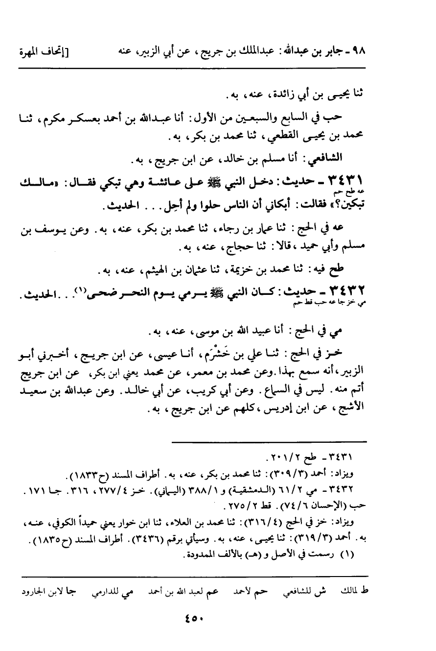 (قط) فِي الْحَجِّ: ثنا الْحُسَيْنُ بْنُ إِسْمَاعِيلَ، ثنا عُمَرُ بْنُ شَبَّةَ، ثنا يَحْيَى، عَنِ ابْنِ جُرَيْجٍ مِثْلَ حَدِيثِ عِيسَى. وَعَنِ الْحُسَيْنِ بْنِ إِسْمَاعِيلَ، ثنا عَلِيُّ بْنُ شُعَيْبٍ، ثنا عَبْدُ الْمَجِيدِ بْنُ عَبْدِ الْعَزِيزِ بْنِ أَبِي رَوَّادٍ، عَنِ ابْنِ جُرَيْجٍ، بِهِ. وَعَنْ عَبْدِ اللَّهِ بْنِ مُحَمَّدِ بْنِ عَبْدِ الْعَزِيزِ، ثنا أَبُو بَكْرٍ ابْنُ أَبِي شَيْبَةَ، ثنا أَبُو خَالِدٍ الأَحْمَرُ، وَعَبْدُ اللَّهِ بْنُ إِدْرِيسَ، بِهِ.