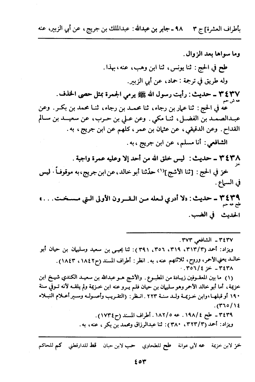 3437 - حَدِيثُ (عه ش حم) : رَأَيْتُ رَسُولَ اللَّهِ صَلَّى اللَّهُ عَلَيْهِ وَسَلَّمَ يَرْمِي الْجَمْرَةَ بِمِثْلِ حَصَى الْخَذْفِ.