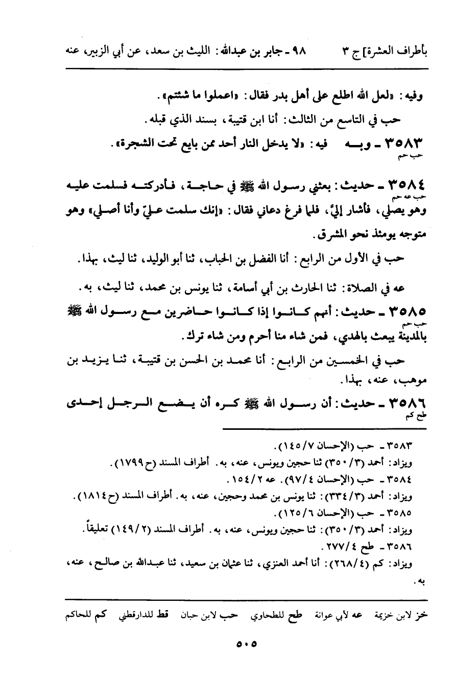 3584 - حَدِيثُ (حب عه حم) : بَعَثَنِي رَسُولُ اللَّهِ صَلَّى اللَّهُ عَلَيْهِ وَسَلَّمَ فِي حَاجَةٍ، فَأَدْرَكْتُهُ فَسَلَّمْتُ عَلَيْهِ وَهُوَ يُصَلِّي، فَأَشَارَ إِلَيَّ، فَلَمَّا فَرَغَ دَعَانِي، فَقَالَ: " إِنَّكَ سَلَّمْتَ عَلَيَّ وَأَنَا أُصَلِّي "، وَهُوَ مُتَوَجِّهٌ يَوْمَئِذٍ نَحْوَ الْمَشْرِقِ.