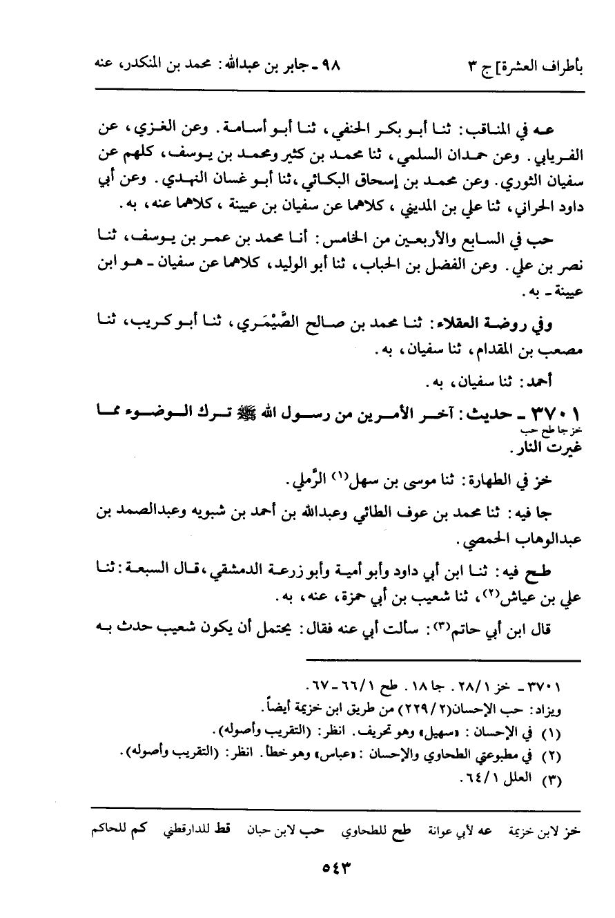 3701 - حَدِيثُ (خز جا طح حب) : آخِرُ الأَمْرَيْنِ مِنْ رَسُولِ اللَّهِ صَلَّى اللَّهُ عَلَيْهِ وَسَلَّمَ تَرْكُ الْوُضُوءِ مِمَّا غَيَّرَتِ النَّارُ.