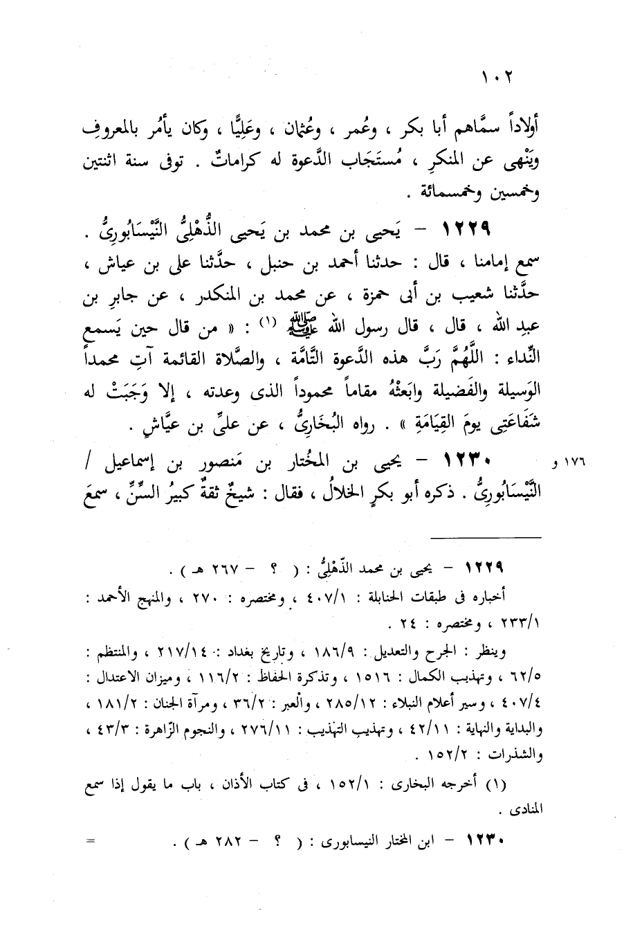 1229 - يحيى بن مُحَمَّد بن يحيى الذهلى النيسابورى سمع إمامنا قَالَ حَدثنَا أَحْمد بن حَنْبَل حَدثنَا على بن عَيَّاش حَدثنَا شُعَيْب بن أَبى حَمْزَة عَن مُحَمَّد بن الْمُنْكَدر عَن جَابر بن عبد الله قَالَ رَسُول الله من قَالَ حِين يسمع النداء اللَّهُمَّ رب هَذِه الدعْوَة التَّامَّة وَالصَّلَاة الْقَائِمَة ات مُحَمَّدًا الْوَسِيلَة والفضيلة وابعثه مقَاما مَحْمُودًا الذى وعدته إِلَّا وَجَبت لَهُ شفاعتى يَوْم الْقِيَامَة