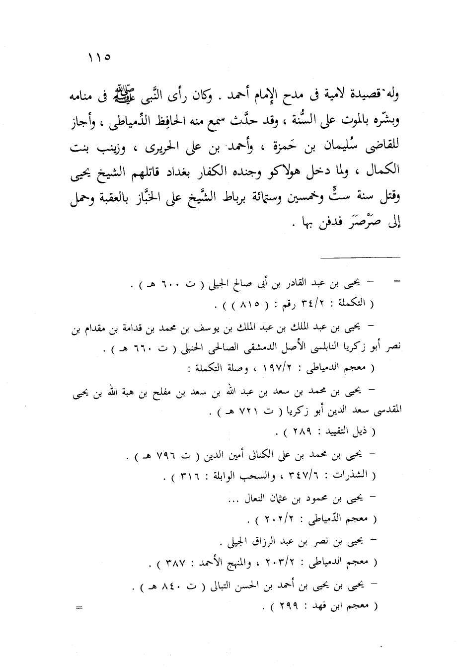 وَكَانَ راى النبى فى مَنَامه وبشره بِالْمَوْتِ على السّنة وَقد حدث سمع مِنْهُ الْحَافِظ الدمياطى وَأَجَازَ للقاضى سُلَيْمَان بن حَمْزَة وَأحمد بن على الجريرى وَزَيْنَب بنت الْكَمَال وَلما دخل هولاكو وجنده الْكفَّار بَغْدَاد قَاتلهم الشَّيْخ يحيى وَقتل سنة سِتّ وَخمسين وسِتمِائَة برباط الشَّيْخ على الخباز بِالْعقبَةِ وَحمل إِلَى صَرْصَر فَدفن بهَا