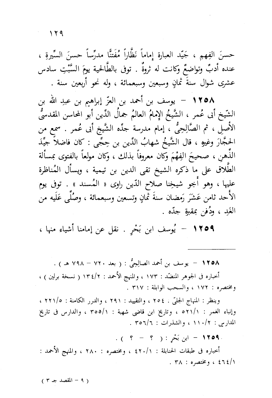 1258 - يُوسُف بن أَحْمد بن الْعِزّ إِبْرَاهِيم بن عبد الله بن الشَّيْخ أَبى عمر الشَّيْخ الإِمَام الْعَالم جمال الدّين أَبُو المحاسن المقدسى الأَصْل ثمَّ الصالحى إِمَام مدرسة جده الشَّيْخ أَبى عمر