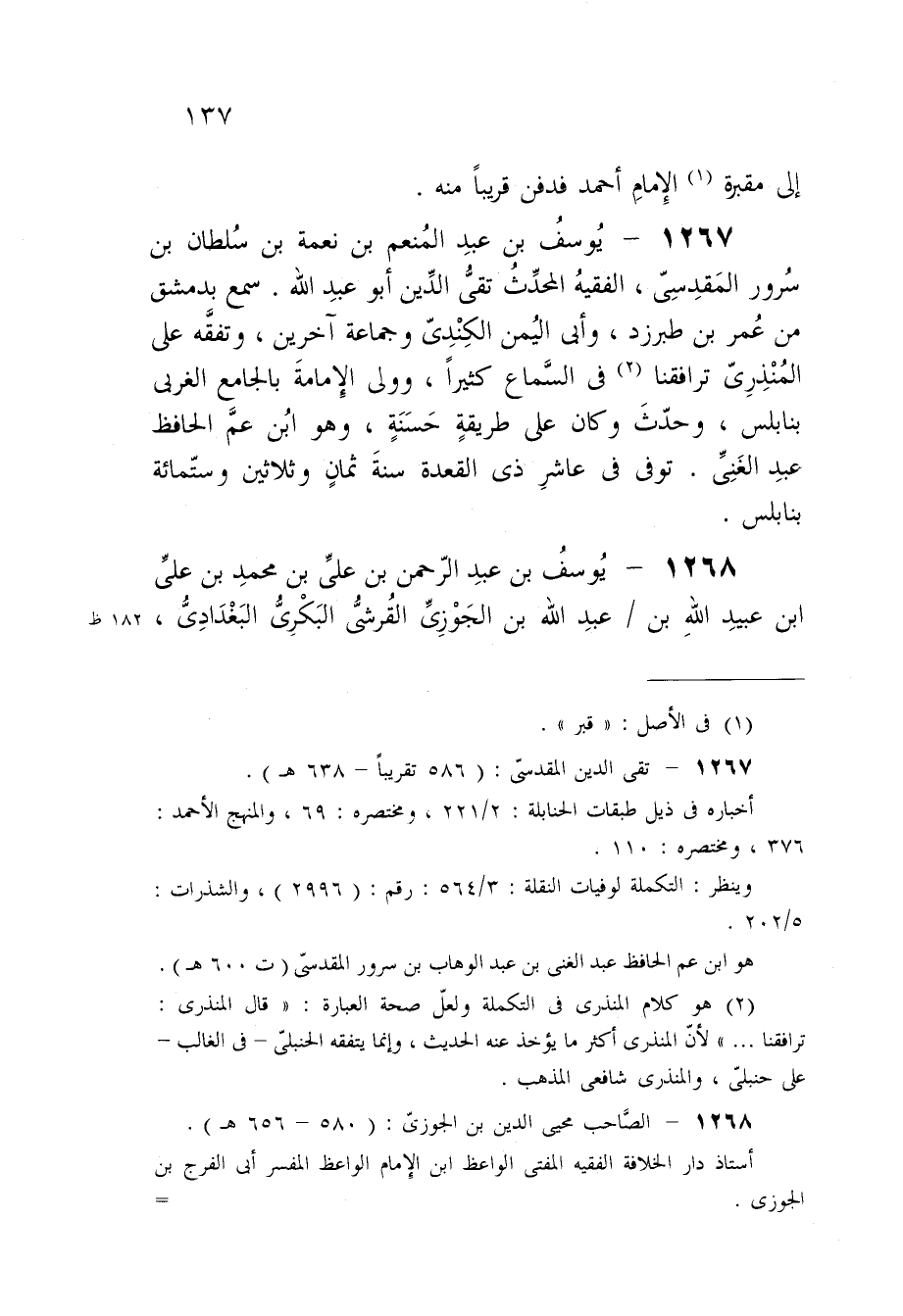 1267 - يُوسُف بن عبد الْمُنعم بن نعْمَة بن سُلْطَان بن سرُور المقدسى الْفَقِيه الْمُحدث تقى الدّين أَبُو عبد الله