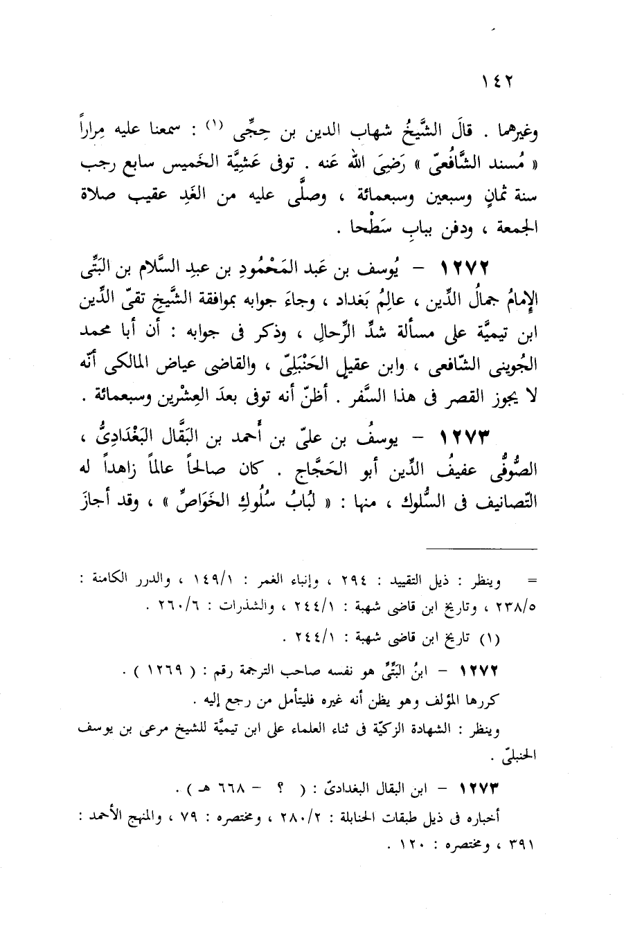 1272 - يُوسُف بن عبد الْمَحْمُود بن عبد السَّلَام بن النبى الإِمَام جمال الدّين عَالم بَغْدَاد وَجَاء جَوَابه بموافقة الشَّيْخ تقى الدّين ابْن تَيْمِية على مَسْأَلَة شدّ الرّحال وَذكر فى جَوَابه أَن أَبَا مُحَمَّد الجوينى الشافعى وَابْن عقيل الحنبلى والقاضى عِيَاض المالكى أَنه لَا يجوز الْقصر فى هَذَا السّفر