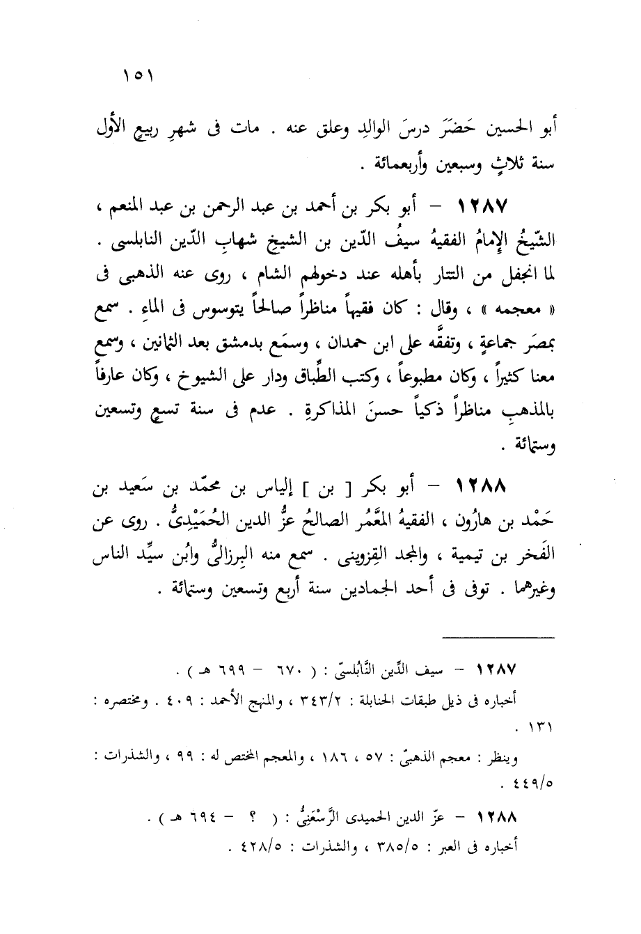 1287 - أَبُو بكر بن أَحْمد بن عبد الرَّحْمَن بن عبد الْمُنعم الشَّيْخ الإِمَام الْفَقِيه سيف الدّين بن الشَّيْخ شهَاب الدّين النابلسى لما انجفل من التتار بأَهْله عِنْد دُخُولهمْ الشَّام روى عَنهُ الذهبى فى مُعْجَمه وَقَالَ كَانَ فَقِيها مناظرا صَالحا يتوسوس فى المَاء