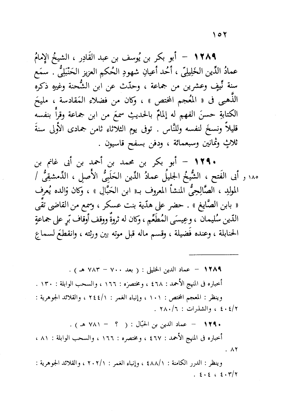 1289 - أَبُو بكر بن يُوسُف بن عبد الْقَادِر الشَّيْخ الإِمَام عماد الدّين الخليلى أحد أَعْيَان شُهُود الحكم الْعَزِيز الحنبلى