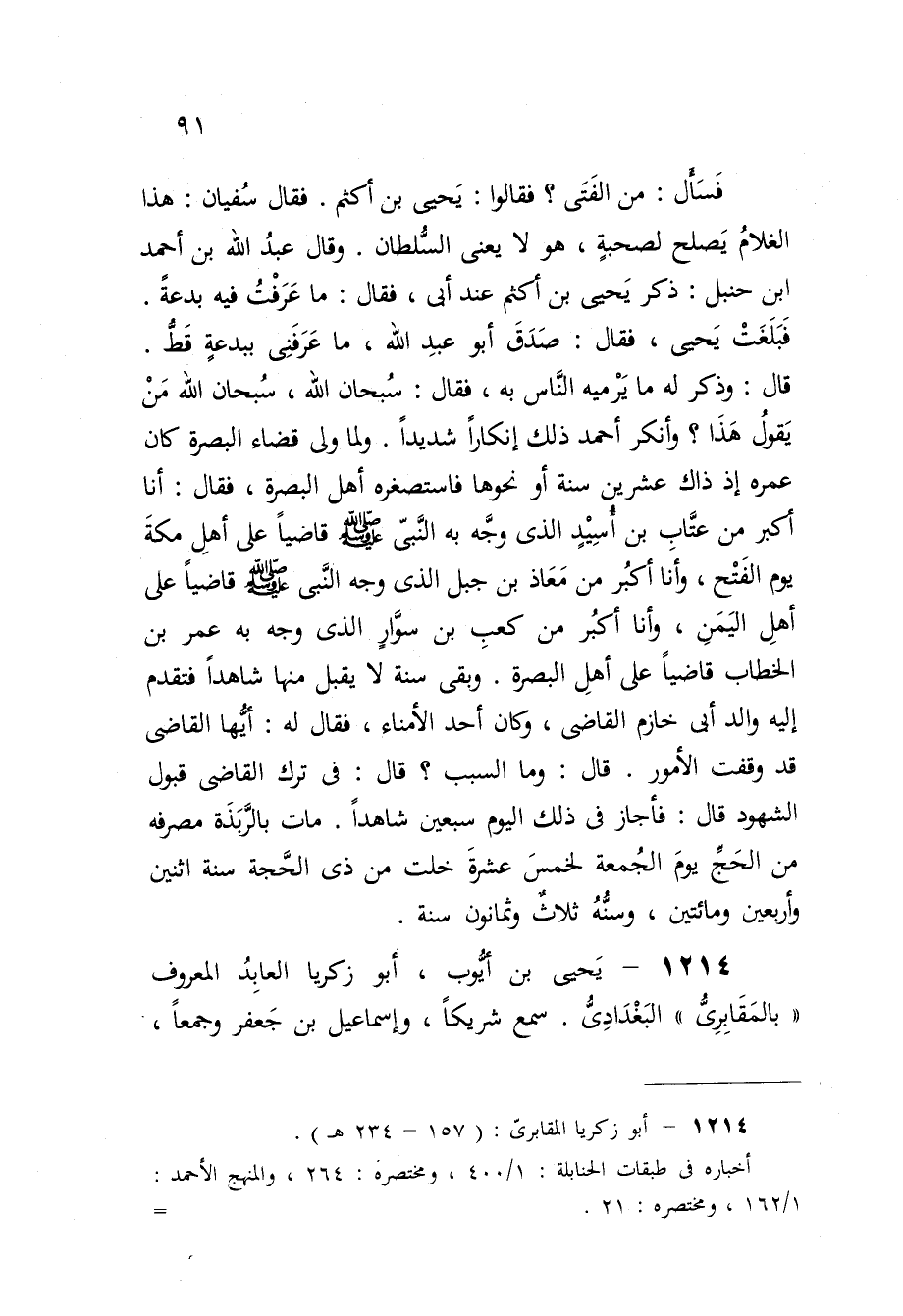 وَقَالَ عبد الله بن أَحْمد ابْن حَنْبَل ذكر يحيى بن أَكْثَم عِنْد أَبى فَقَالَ مَا عرفت فِيهِ بِدعَة