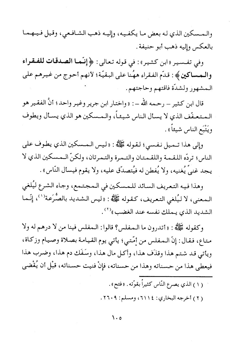 قال ابن كثير -رحمه الله-: "واختار ابن جرير وغير واحد؛ أنَّ الفقير هو المتعفّف الذي لا يسأل الناس شيئاً، والمسكين هو الذي يسأل ويطوف ويَتْبَع الناس شيئاً".