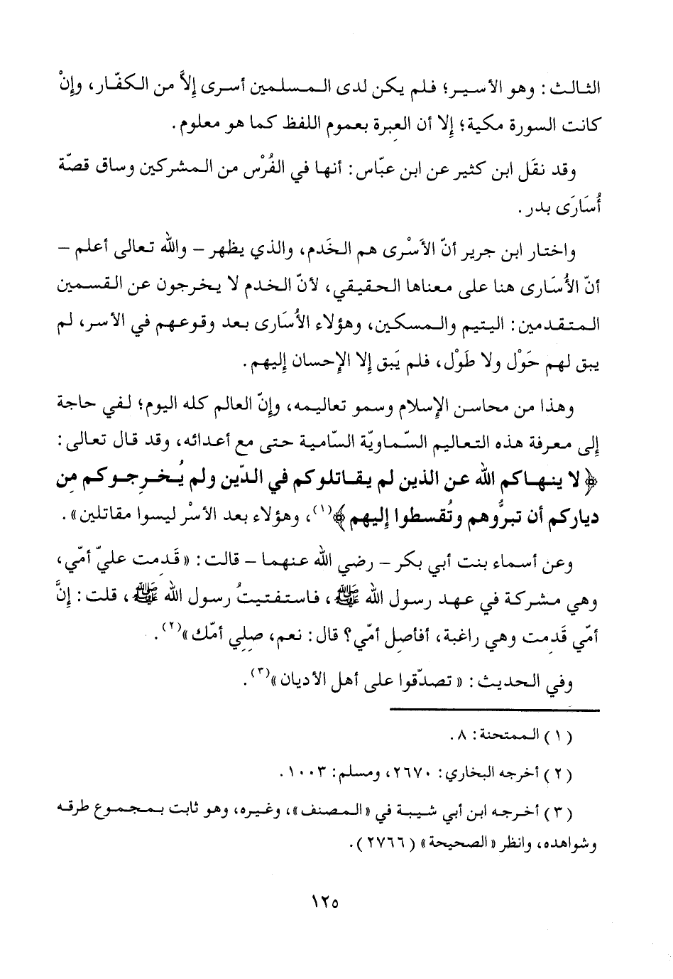 وهذا من محاسن الإِسلام وسمو تعاليمه، وإنّ العالم كله اليوم؛ لفي حاجة إِلى معرفة هذه التعاليم السّماويّة السّامية حتى مع أعدائه، وقد قال تعالى: {لا ينهاكم الله عن الذين لم يقاتلوكم في الدّين ولم يُخرِجوكم مِن دياركم أن تبرُّوهم وتُقسطوا إِليهم} (¬1)، وهؤلاء بعد الأسْر ليسوا مقاتلين".