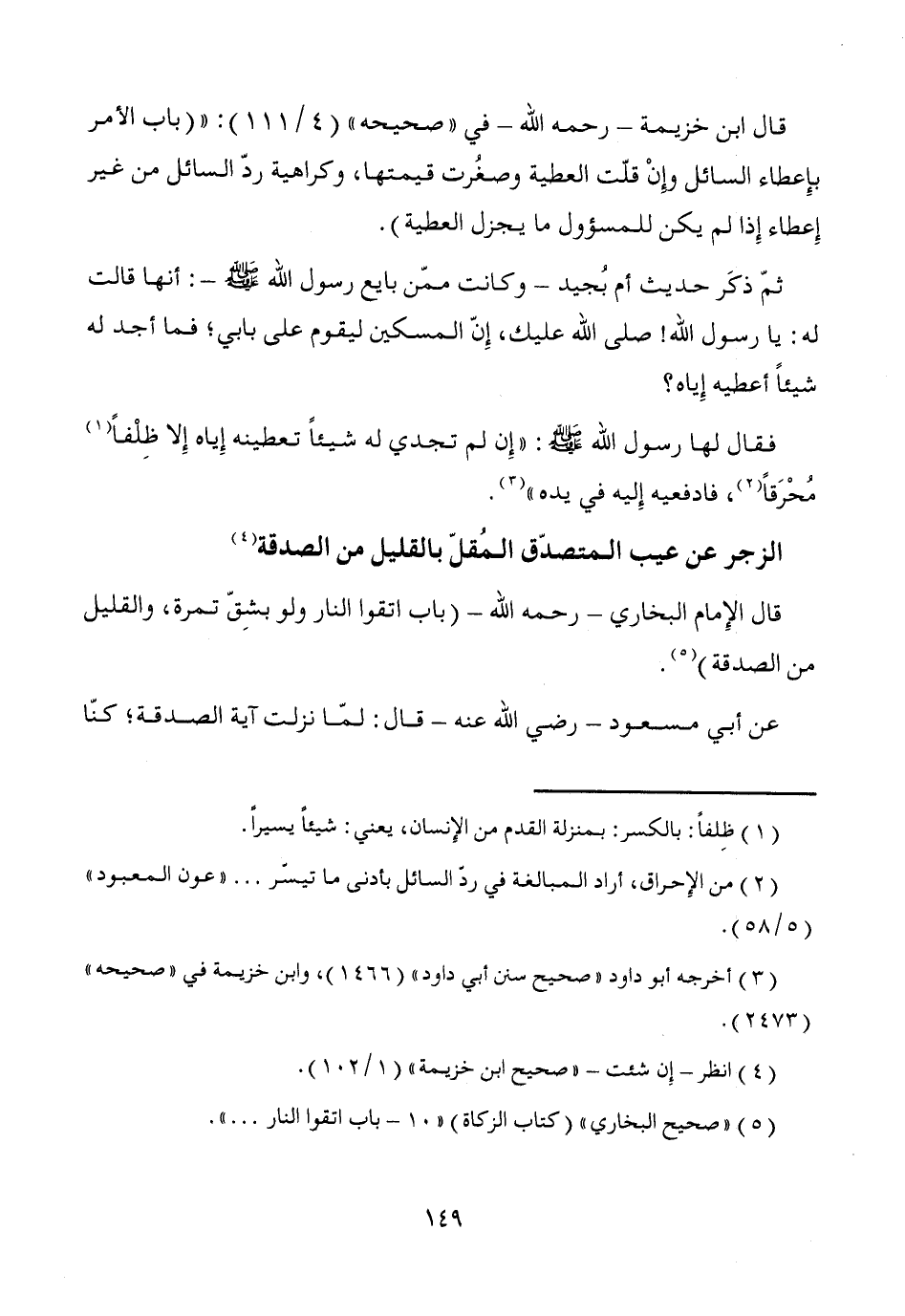 قال ابن خزيمة -رحمه الله- في "صحيحه" (4/ 111): " (باب الأمر بإِعطاء السائل وإن قلّت العطية وصغُرت قيمتها، وكراهية ردّ السائل من غير إِعطاء إِذا لم يكن للمسؤول ما يجزل العطية).