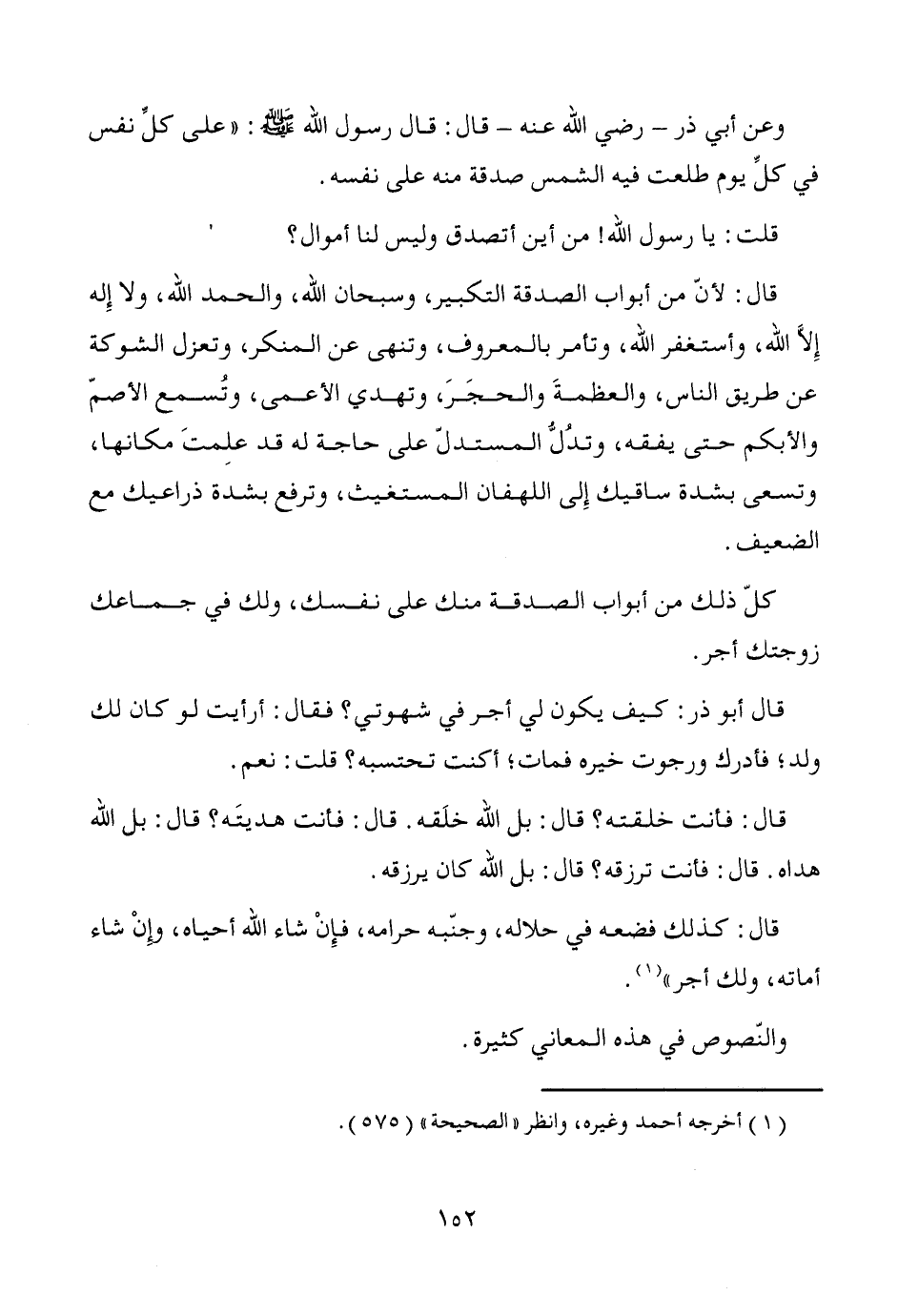 وعن أبي ذر -رضي الله عنه- قال: قال رسول الله - صَلَّى اللَّهُ عَلَيْهِ وَسَلَّمَ -: "على كلِّ نفس في كلِّ يوم طلعت فيه الشمس صدقة منه على نفسه.