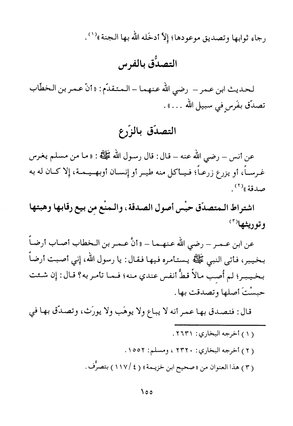 عن ابن عمر -رضي الله عنهما- "أنَّ عمر بن الخطاب أصاب أرضاً بخيبر، فأتى النبي - صَلَّى اللَّهُ عَلَيْهِ وَسَلَّمَ - يستأمره فيها فقال: يا رسول الله، إِني أصبت أرضاً بخيبر؛ لم أُصِب مالاً قطُّ أنفس عندي منه؛ فما تأمر به؟ قال: إِن شئت حبسْتَ أصلها وتصدقت بها.