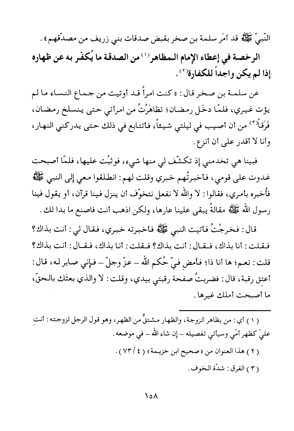 قال: فخرجْتُ فأتيت النبي - صَلَّى اللَّهُ عَلَيْهِ وَسَلَّمَ - فأخبرته خبري، فقال لي: أنت بذاك؟ فقلت: أنا بذاك، فقال: أنت بذاك؟ فقلت: أنا بذاك، فقال: أنت بذاك؟ قلت: نعم؛ ها أنا ذا؛ فأَمضِ فيّ حُكم الله -عزّ وجلّ- فإِني صابر له، قال: أعتِق رقبة، قال: فضربتُ صفحة رقبتي بيدي، وقلت: لا والذي بعثَك بالحقّ، ما أصبحت أملك غيرها.