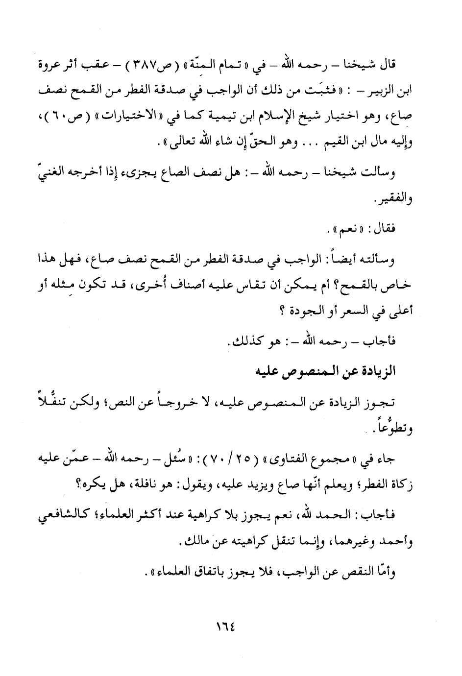 قال شيخنا -رحمه الله- في "تمام المِنّة" (ص387) -عقب أثر عروة ابن الزبير-: "فثبَت من ذلك أن الواجب في صدقة الفطر من القمح نصف صاع، وهو اختيار شيخ الإِسلام ابن تيمية كما في "الاختيارات" (ص 60)، وإليه مال ابن القيم ... وهو الحقّ إِن شاء الله تعالى".