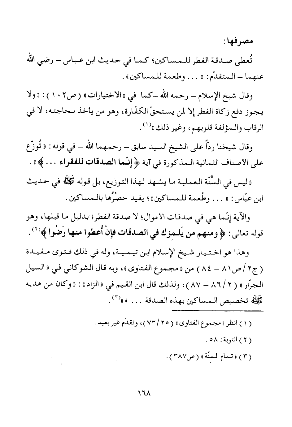 وهذا هو اختيار شيخ الإِسلام ابن تيمية، وله في ذلك فتوى مفيدة (ج2/ص81 - 84) من "مجموع الفتاوى"، وبه قال الشوكاني في "السيل الجرّار" (2/ 86 - 87)، ولذلك قال ابن القيم في "الزاد": "وكان من هديه - صَلَّى اللَّهُ عَلَيْهِ وَسَلَّمَ - تخصيص المساكين بهذه الصدقة ... "" (¬3).