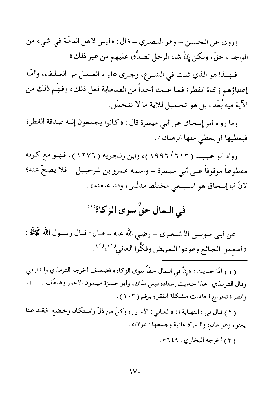 (¬1) أمّا حديث: "إِنَّ في المال حقّاً سوى الزكاة" فضعيف أخرجه الترمذي والدارمي وقال الترمذي: هذا حديث إِسناده ليس بذاك، وأبو حمزة ميمون الأعور يضعّف ... ".