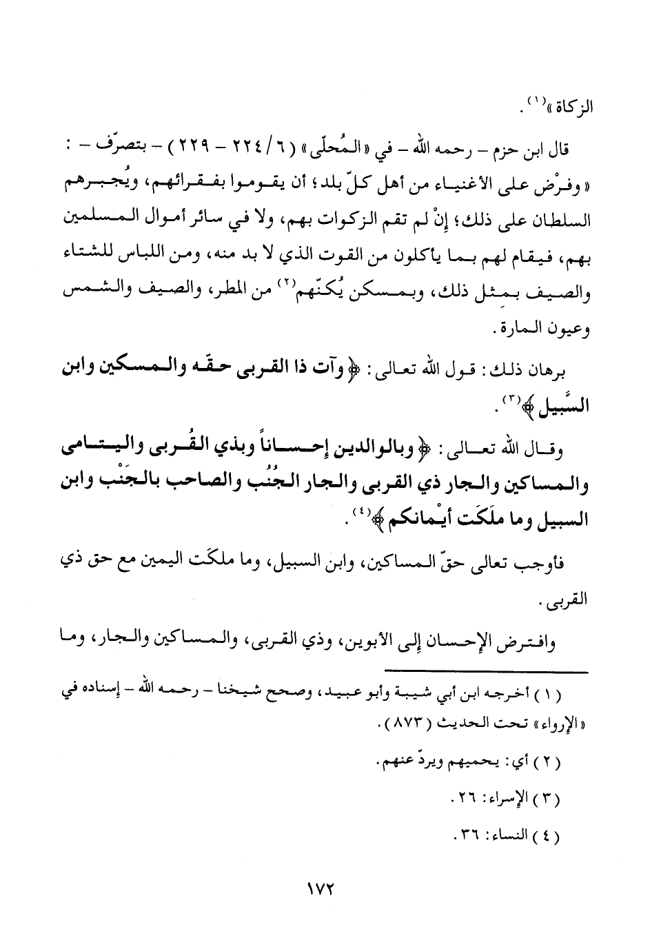 قال ابن حزم -رحمه الله- في "المحلّى" (6/ 224 - 229) -بتصرّف-: "وفرْض على الأغنياء من أهل كلّ بلد؛ أن يقوموا بفقرائهم، ويُجبرهم السلطان على ذلك؛ إِنْ لم تقم الزكوات بهم، ولا في سائر أموال المسلمين بهم، فيقام لهم بما يأكلون من القوت الذي لا بد منه، ومن اللباس للشتاء والصيف بمِثل ذلك، وبمسكن يُكنّهم (¬2) من المطر، والصيف والشمس وعيون المارة.